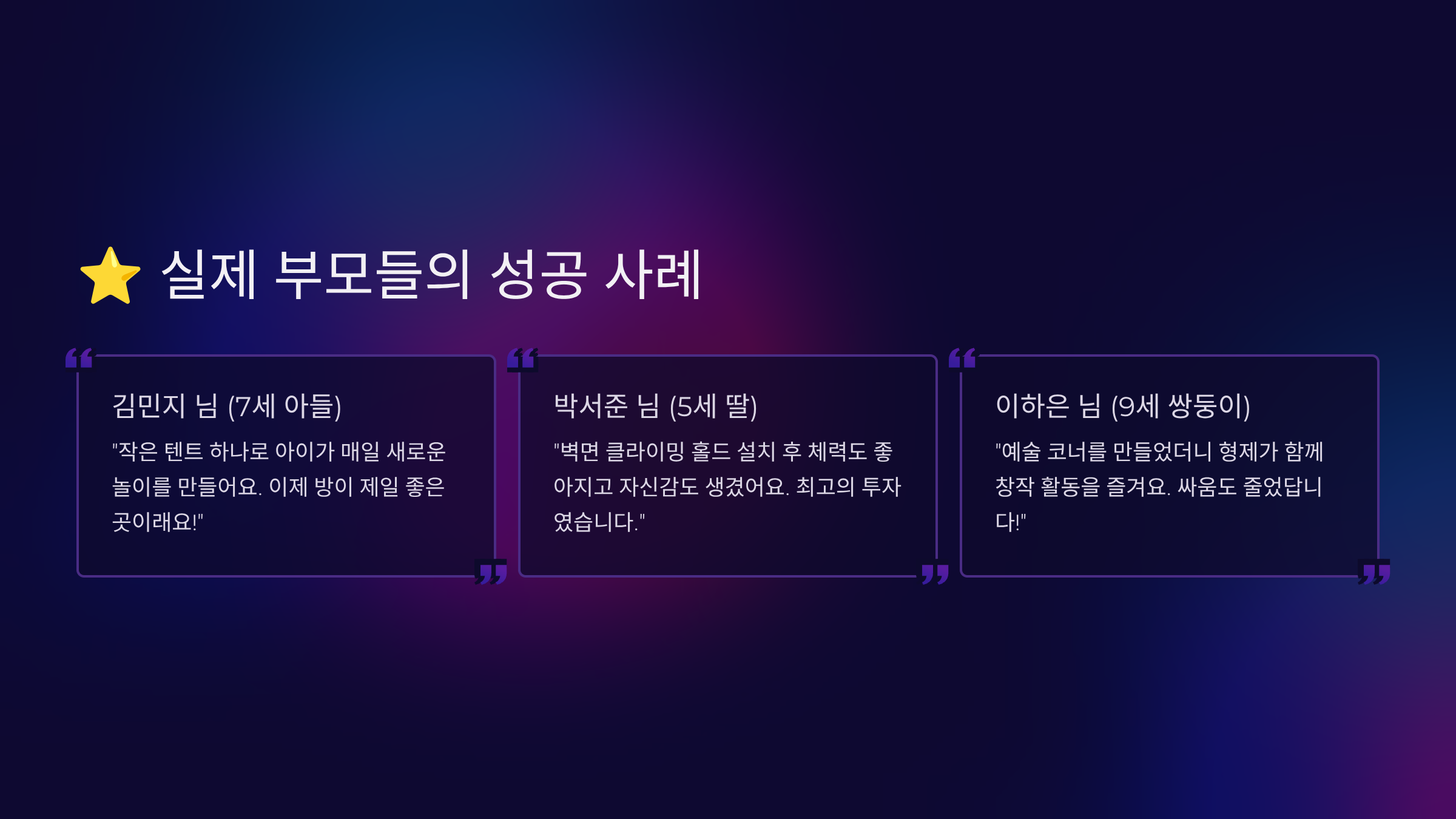 서울에 사는 김지영 씨(38세)의 이야기를 들려드릴게요. "처음엔 막막했어요. 인테리어 감각도 없고, 비용도 부담스러웠죠. 하지만 아이와 함께 하나씩 만들어가니 그 과정 자체가 즐거웠어요. 총비용은 15만 원 정도였는데, 아이가 매일 그 공간에서 노는 걸 보면 정말 잘한 선택이었다고 생각해요."