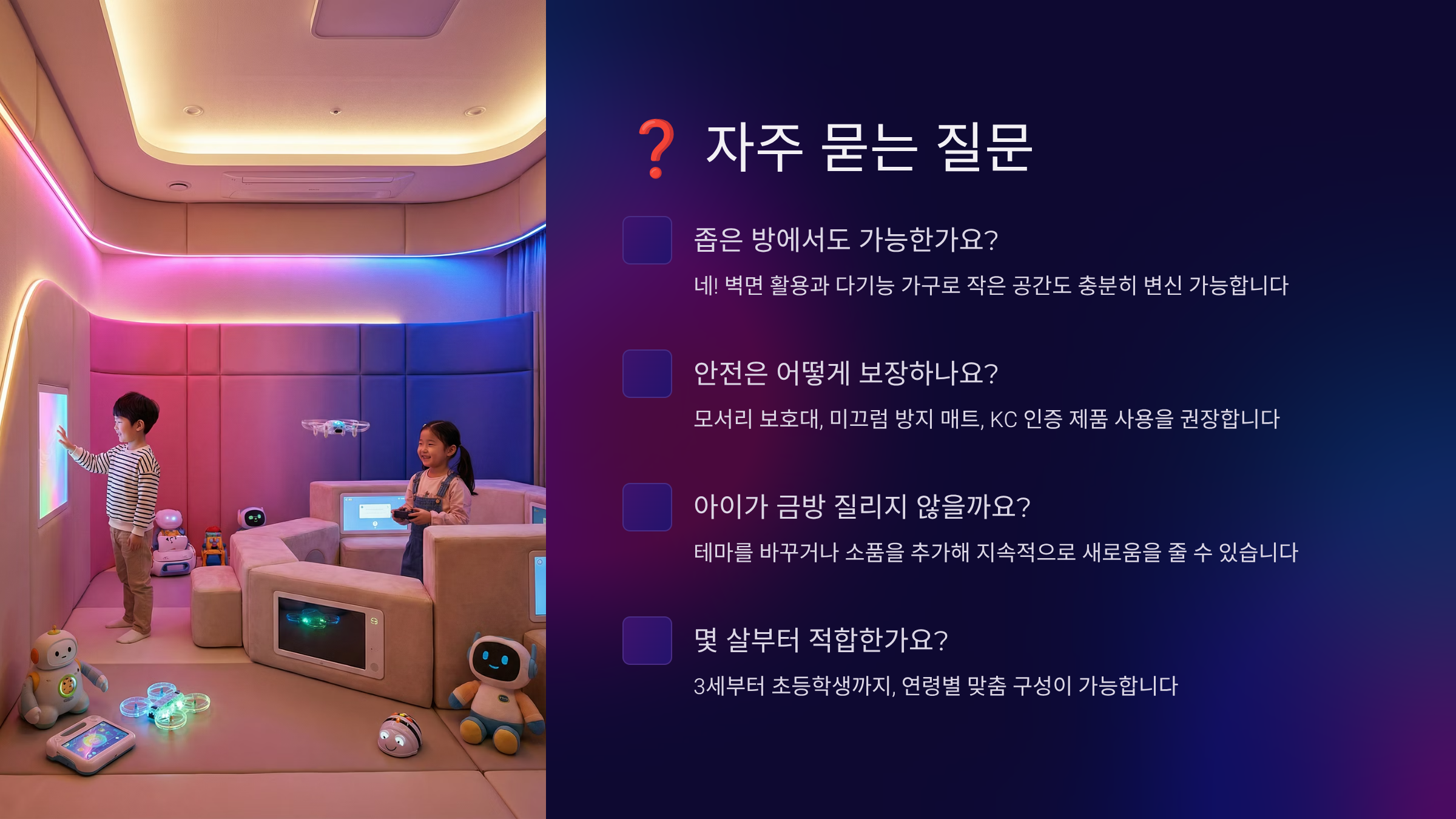 A15. 유아기에는 감각 놀이 중심, 초등 저학년은 역할 놀이, 고학년은 학습 공간으로 점진적으로 변화시키세요. 기본 구조는 유지하되 내부 소품과 용도를 바꿔가며 활용하면 오래 사용할 수 있어요.