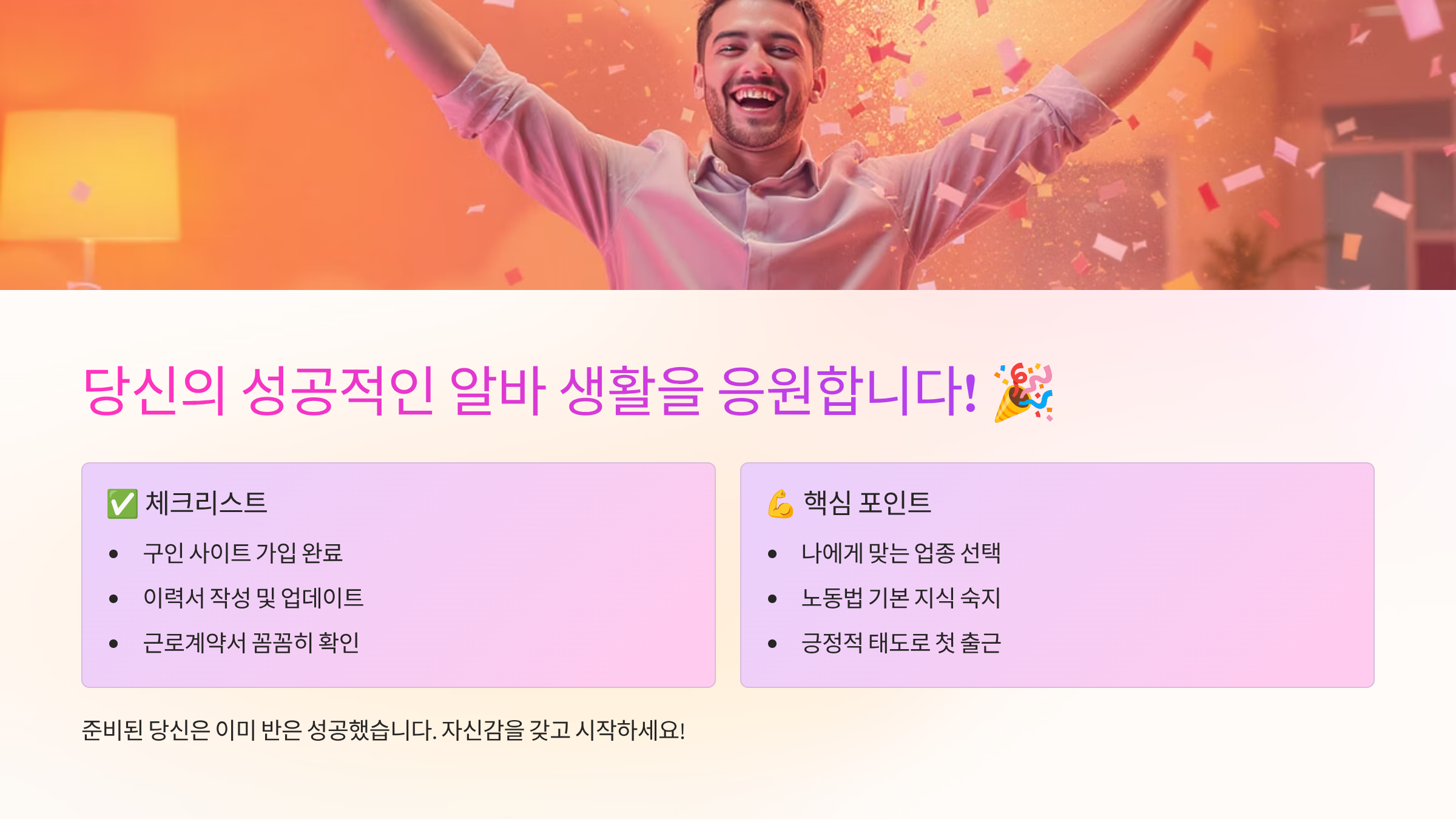 마지막으로 긍정적인 마인드를 유지하세요! 힘들 때도 있겠지만, 이 모든 경험이 여러분을 성장시킬 거예요. 알바를 통해 돈뿐만 아니라 사회생활 스킬, 인내심, 책임감을 배울 수 있어요. 저는 알바 경험 덕분에 취업 면접에서도 자신 있게 답변할 수 있었어요. 여러분도 할 수 있어요! 파이팅! 🎉