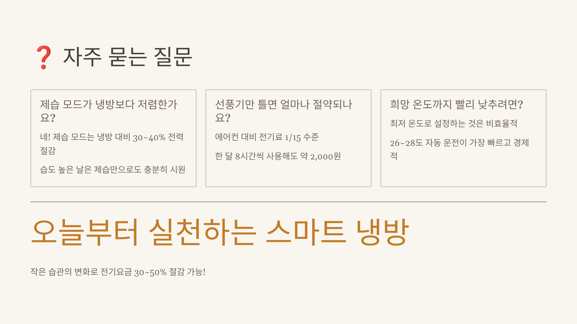 A6. 26~28도가 건강과 전기료 면에서 최적이에요! 실내외 온도차가 5도 이내일 때 냉방병 위험이 적고, 26도는 대부분의 사람이 쾌적하게 느끼는 온도예요. 습도가 낮으면 27~28도도 충분히 시원해요. 개인차가 있으니 25~28도 사이에서 본인에게 맞는 온도를 찾으세요. 잠잘 때는 1~2도 높여도 괜찮아요! 🌡️