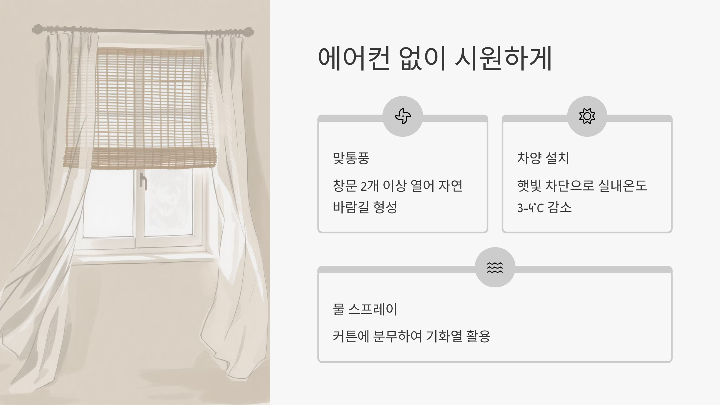 창문을 전략적으로 활용하는 것도 중요해요. 낮에는 커튼을 쳐서 직사광선을 막고, 밤에는 맞통풍이 되도록 창문을 열어두면 자연 바람으로 실내 온도를 낮출 수 있어요. 특히 새벽 시간대의 시원한 공기를 최대한 활용하는 것이 좋답니다.