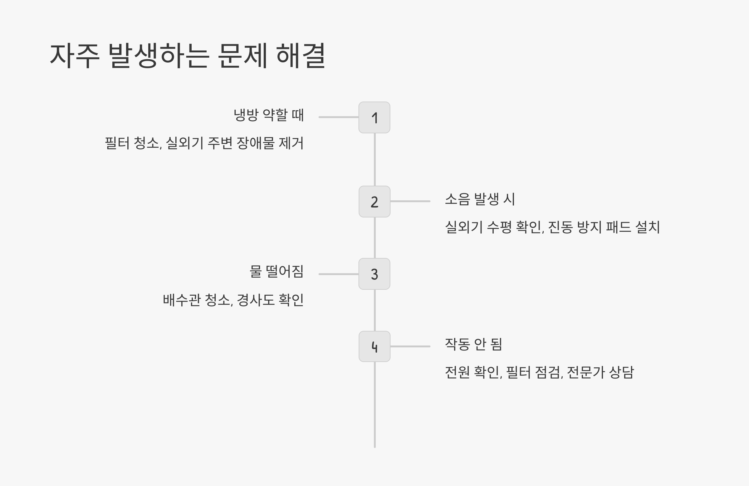 | 자동 꺼짐 | 과열, 전압 이상 | 실외기 점검, 전압 확인 |