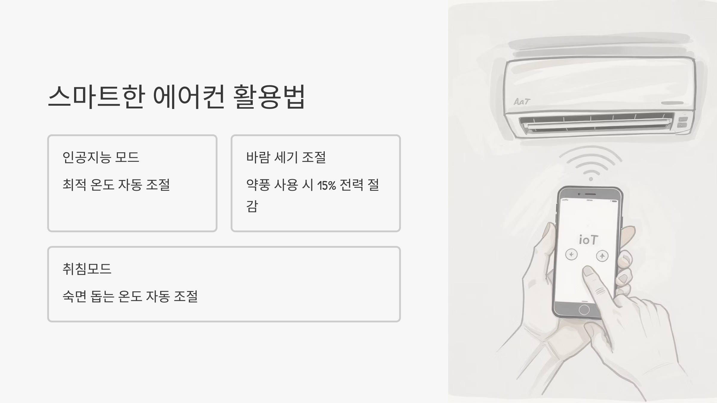 인버터 에어컨으로 교체하는 것도 장기적으로 전기요금을 절약하는 방법이에요. 인버터 에어컨은 실내 온도에 따라 압축기 속도를 자동으로 조절해서 일반 에어컨보다 30~40% 전력을 덜 소비해요. 초기 구입 비용은 비싸지만 전기요금 절약 효과를 생각하면 2~3년 안에 투자비용을 회수할 수 있답니다.