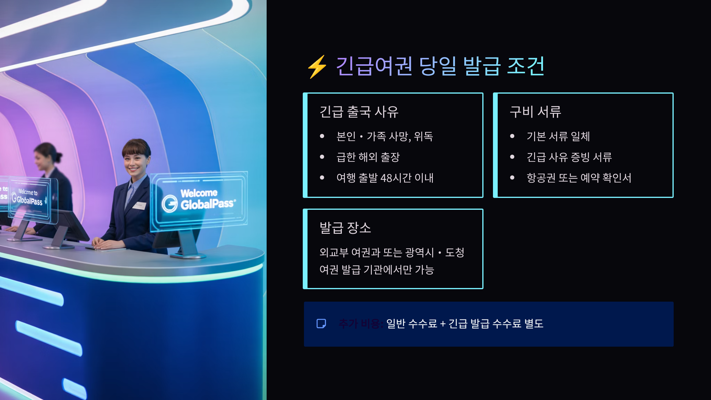긴급여권 발급 조건은 까다로워요. 48시간 이내 출국 예정이어야 하고, 이를 증명할 항공권이나 선박 승선권이 있어야 해요. 또한 긴급한 사유를 증명할 서류도 필요해요. 예를 들어 해외 거주 가족의 사망이나 위독한 경우 병원 진단서나 사망 증명서를, 긴급 출장의 경우 회사의 출장 명령서를 준비해야 해요.