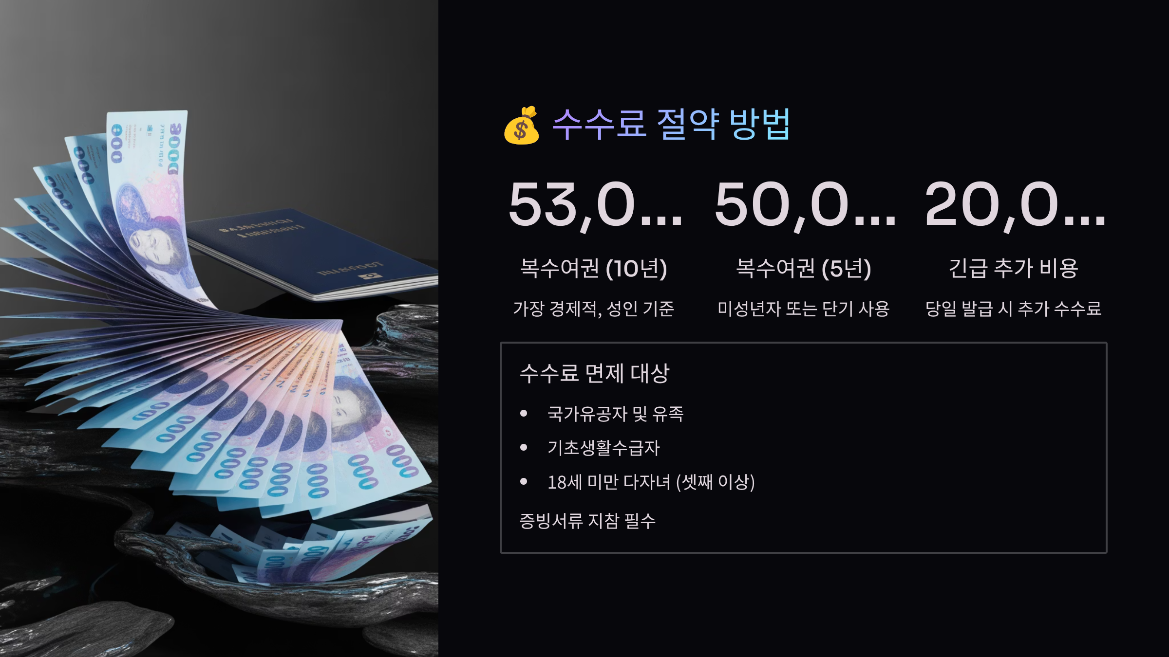 여권 수수료를 절약할 수 있는 방법이 여러 가지 있어요. 가장 쉬운 방법은 온라인 신청인데, 정부 24를 통해 신청하면 2,000원을 할인받을 수 있어요. 별것 아닌 것 같지만 가족 4명이 함께 신청하면 8,000원을 아낄 수 있죠. 커피 두 잔 값이니 무시할 수 없는 금액이에요! 💸