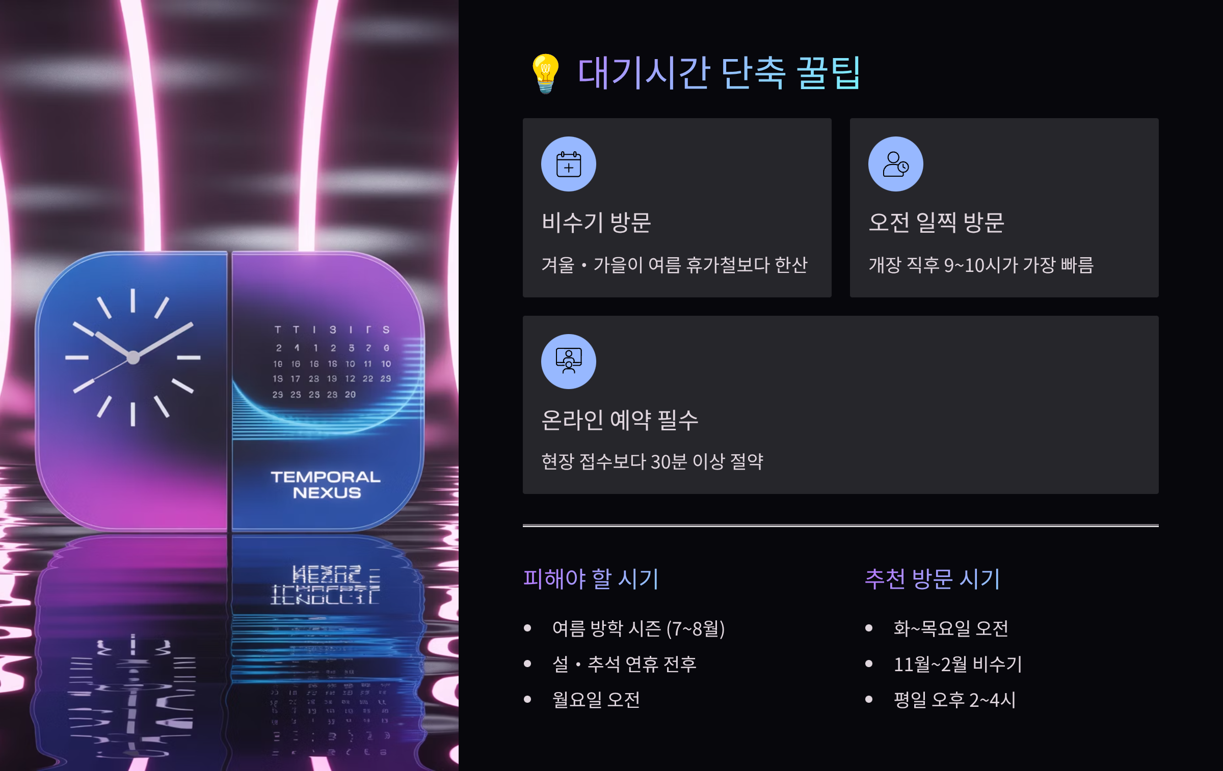 날씨도 고려해야 해요. 비 오는 날이나 폭염, 한파 때는 방문객이 줄어들어요. 불편하긴 하지만 대기 시간을 크게 줄일 수 있어요. 실제로 장마철 평일 오후에 방문하면 예약 없이도 10분 내에 처리 가능한 경우가 많아요. 우산 하나 들고 가는 수고로 1-2시간을 아낄 수 있다면 충분히 가치가 있죠?