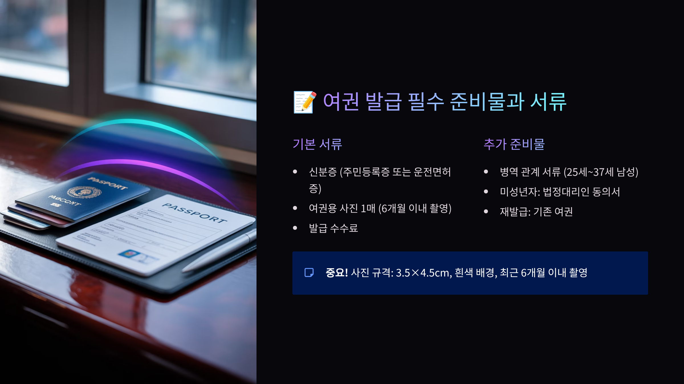 여권 발급을 위해 가장 먼저 준비해야 할 것은 필수 서류예요. 성인 기준으로 신분증과 여권용 사진 2매, 그리고 병역 관련 서류(해당자)가 필요해요. 여권용 사진은 일반 증명사진과 규격이 달라서 반드시 여권 전용으로 찍어야 한답니다. 사진 규격은 3.5cm x 4.5cm이고, 6개월 이내 촬영한 것이어야 해요.