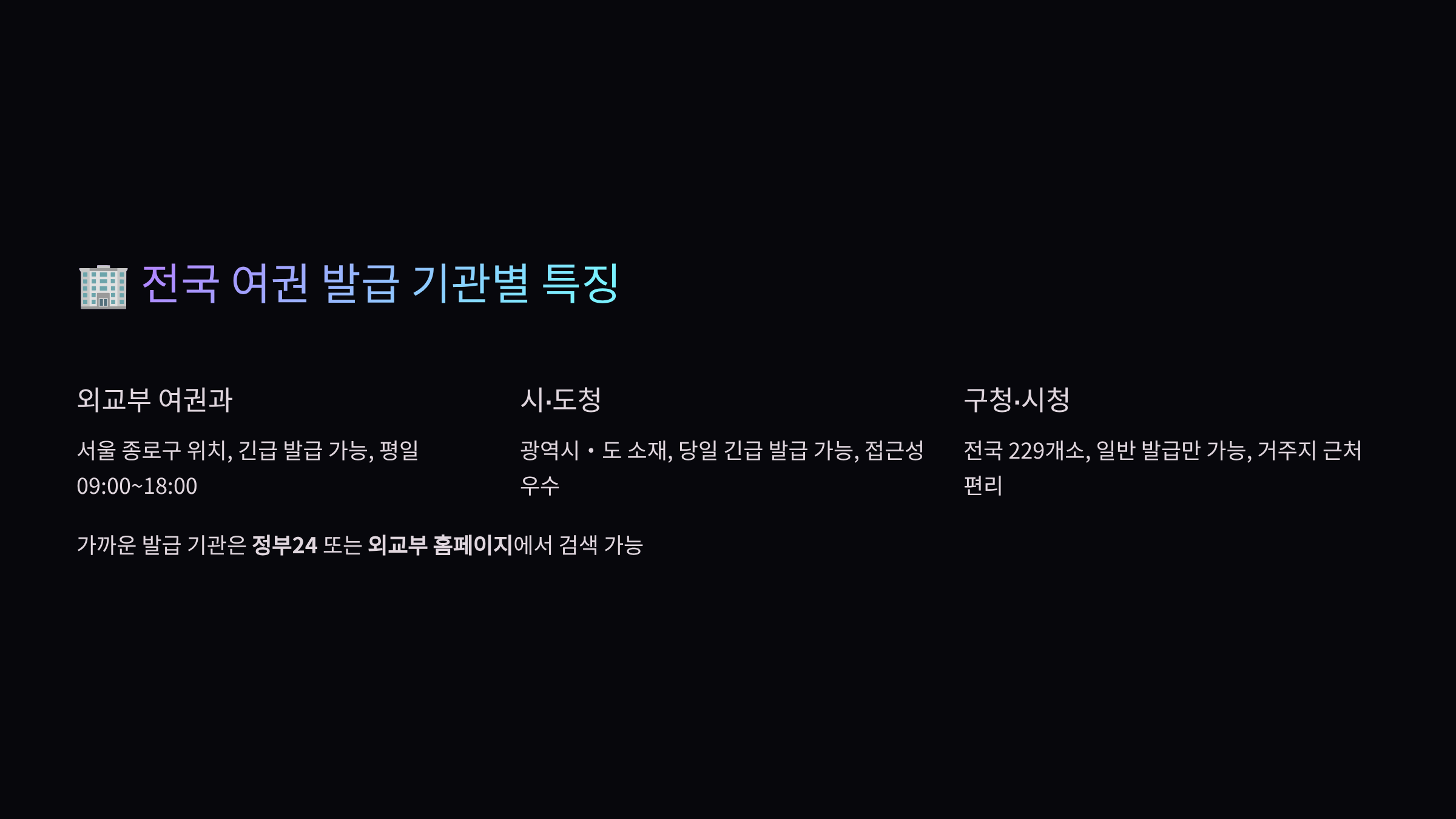 여권은 전국 250여 개 기관에서 발급받을 수 있어요. 시청, 구청, 군청은 물론이고 일부 읍면동 주민센터에서도 가능해요. 각 기관마다 운영 시간과 특징이 다르니 자신에게 맞는 곳을 선택하는 것이 중요해요. 서울의 경우 25개 구청 모두에서 발급이 가능하고, 일부 구청은 토요일에도 운영한답니다! 🏛️