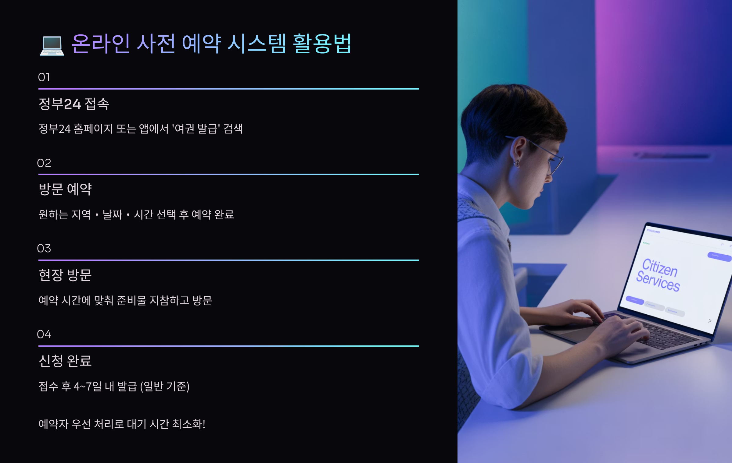 온라인 예약 시스템은 여권 발급의 게임 체인저예요! 🎮 정부 24 사이트나 각 지자체 홈페이지에서 미리 예약하면 현장에서 대기 시간 없이 바로 처리할 수 있어요. 예약은 보통 2주 전부터 가능하고, 원하는 날짜와 시간을 선택할 수 있답니다. 특히 점심시간이나 오후 3시경이 비교적 한가한 편이에요.
