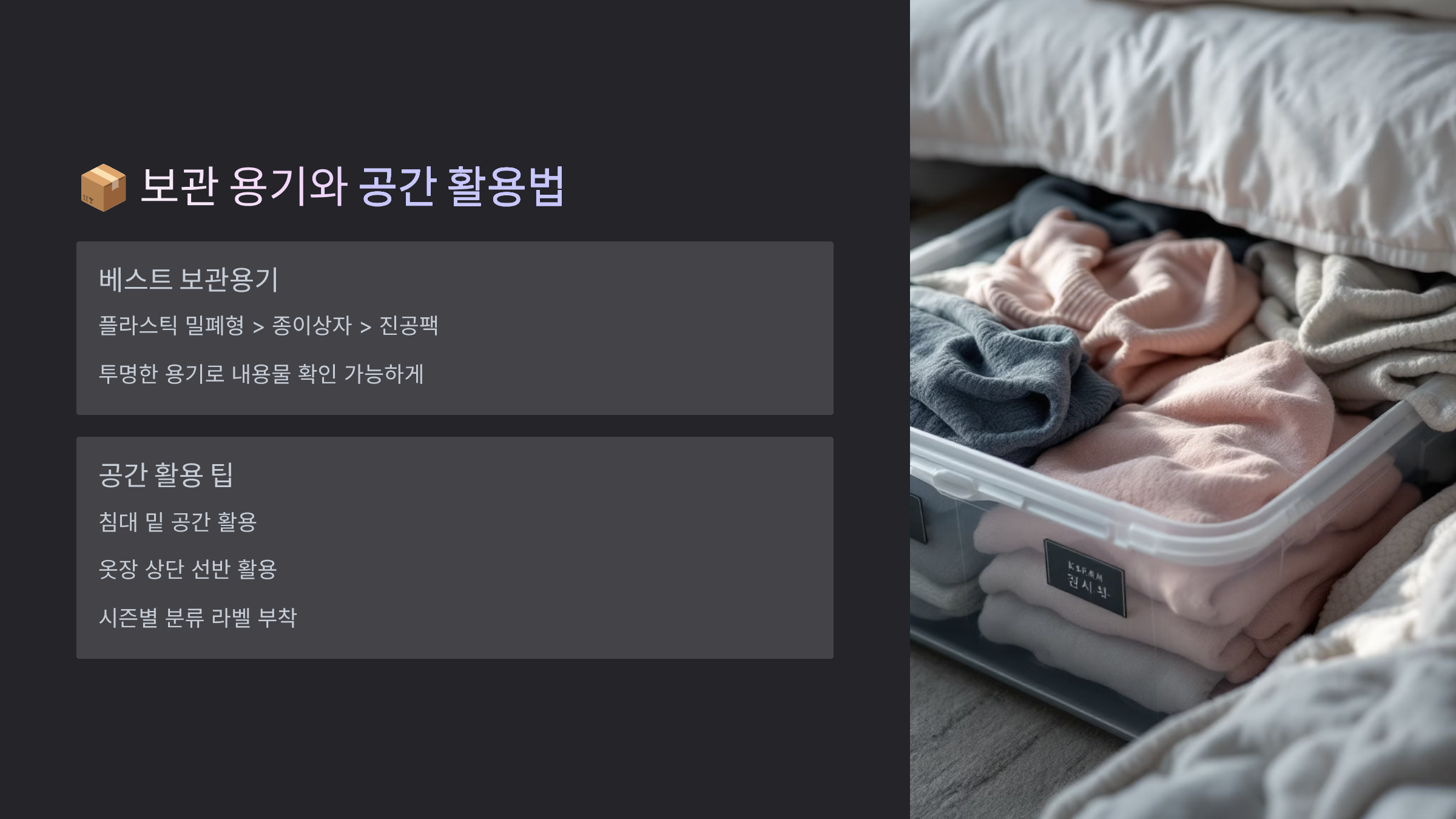 보관 장소도 미리 준비해야 해요. 옷장이나 서랍장을 깨끗이 청소하고, 습기 제거제를 놓아두면 좋아요. 나프탈렌이나 좀약은 옷에 직접 닿지 않도록 주의하세요. 요즘은 천연 방충제인 라벤더나 시더우드 향낭을 많이 사용해요. 향도 좋고 벌레도 싫어한답니다! 💜