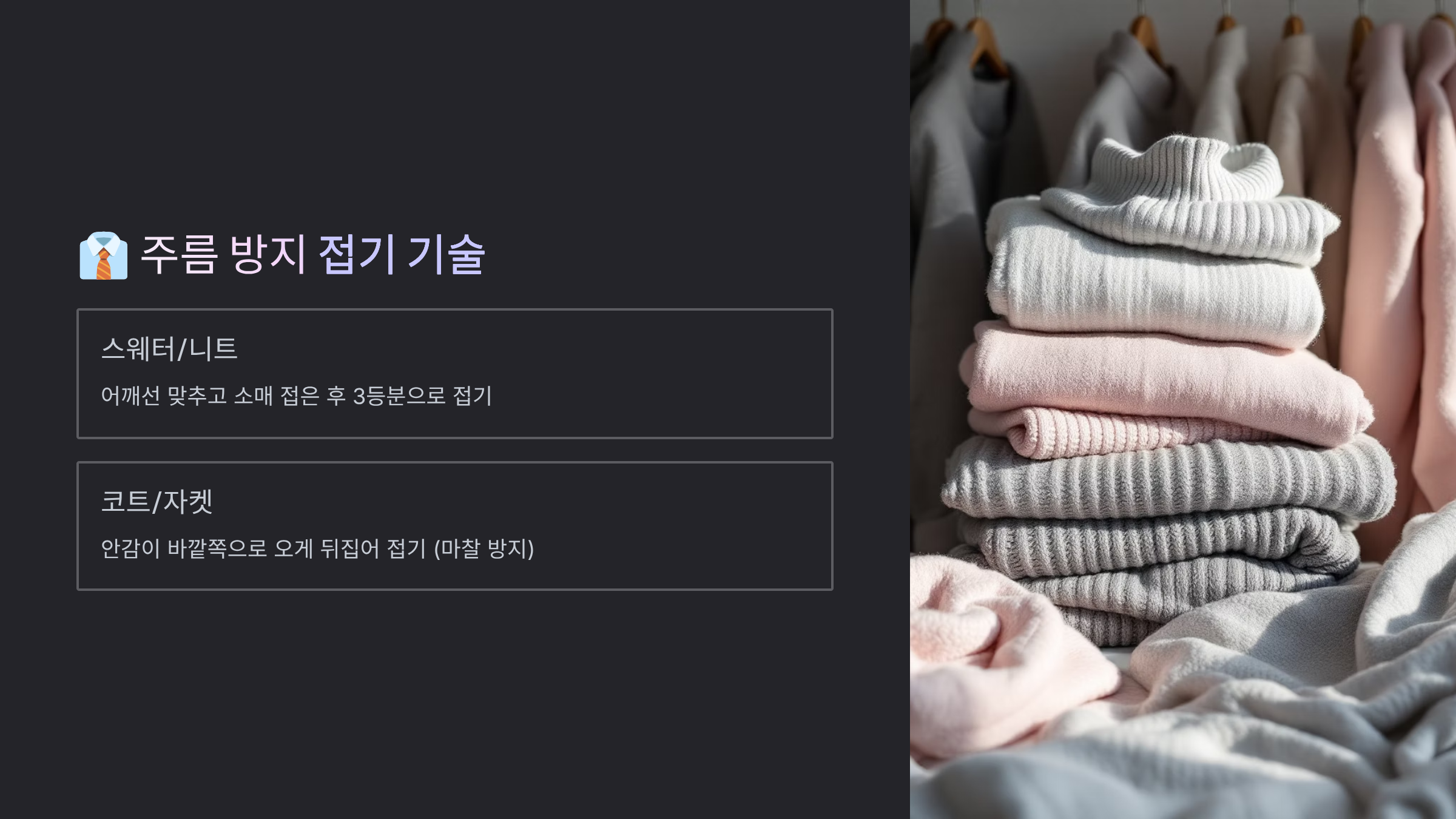 옷을 접는 방법에 따라 주름이 생기는 정도가 완전히 달라져요. 일반적으로 우리가 옷을 접을 때는 대충 반으로 접고 또 반으로 접는 경우가 많은데, 이렇게 하면 접힌 부분에 깊은 주름이 생겨요. 전문 매장에서 사용하는 접기 방법을 알려드릴게요! 👕