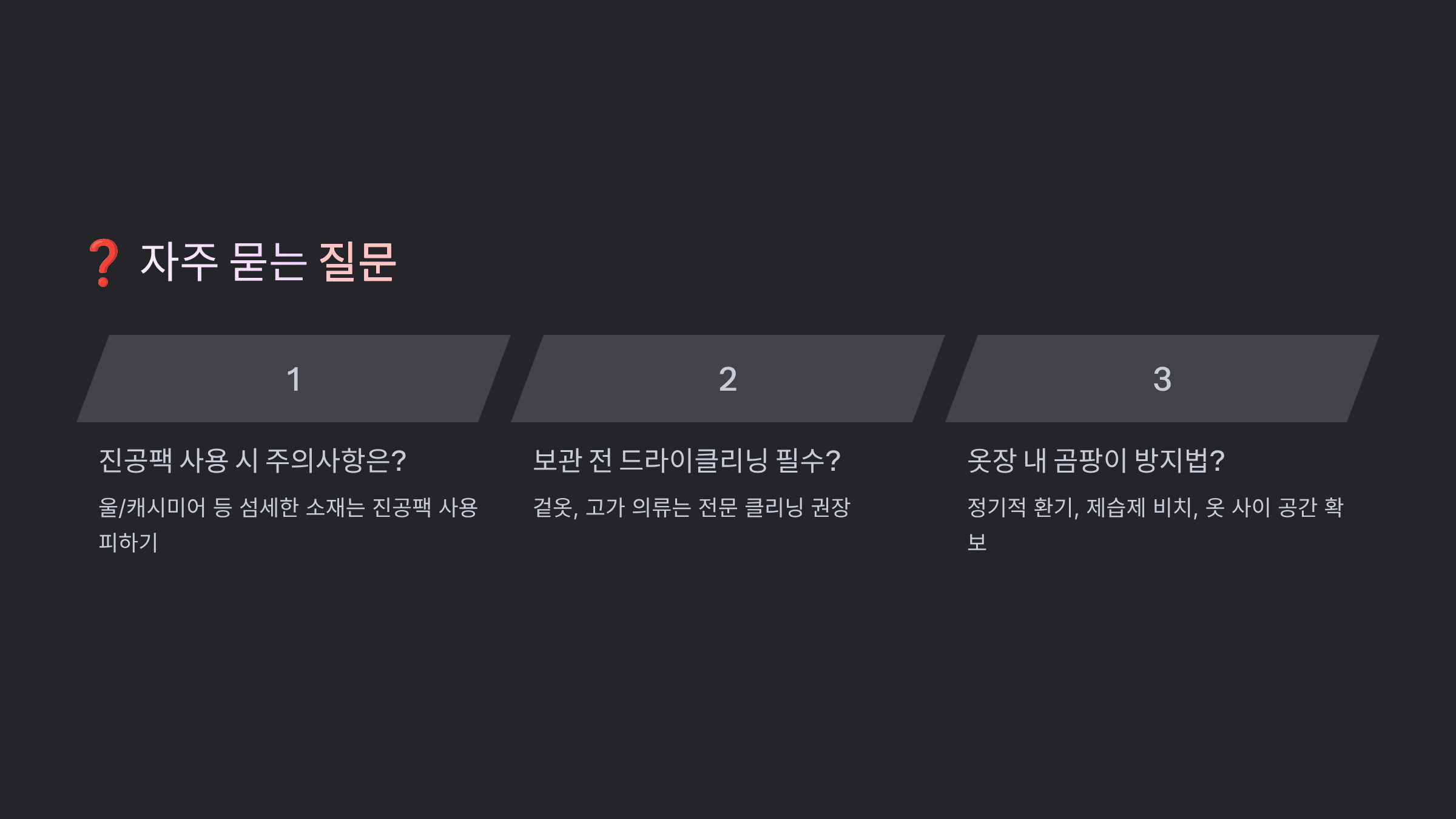 진공 압축팩은 공간을 최대 75%까지 줄일 수 있어서 수납공간이 부족한 집에 최고예요. 이불이나 두꺼운 옷에는 좋지만, 얇은 여름옷은 너무 압축하면 주름이 심하게 생길 수 있어요. 압축할 때는 70% 정도만 압축하고, 옷 사이에 종이를 넣으면 주름을 줄일 수 있어요. 단, 울이나 가죽 소재는 압축하면 안 돼요! ⚠️