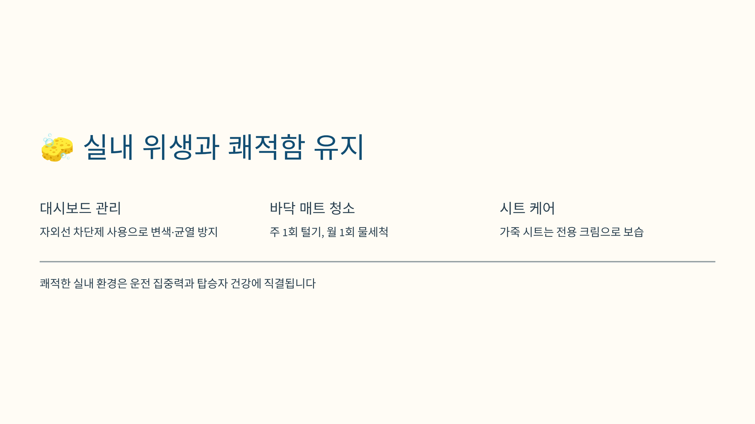 선바이저와 차량용 커튼을 활용하면 실내 온도 상승을 막을 수 있어요. 주차할 때 앞유리에 선바이저를 설치하면 대시보드 온도를 10도 이상 낮출 수 있답니다. 뒷좌석 창문에는 차량용 커튼이나 썬팅을 활용하세요. 깨끗하고 시원한 실내 환경이 안전운전의 시작이에요! 🧽
