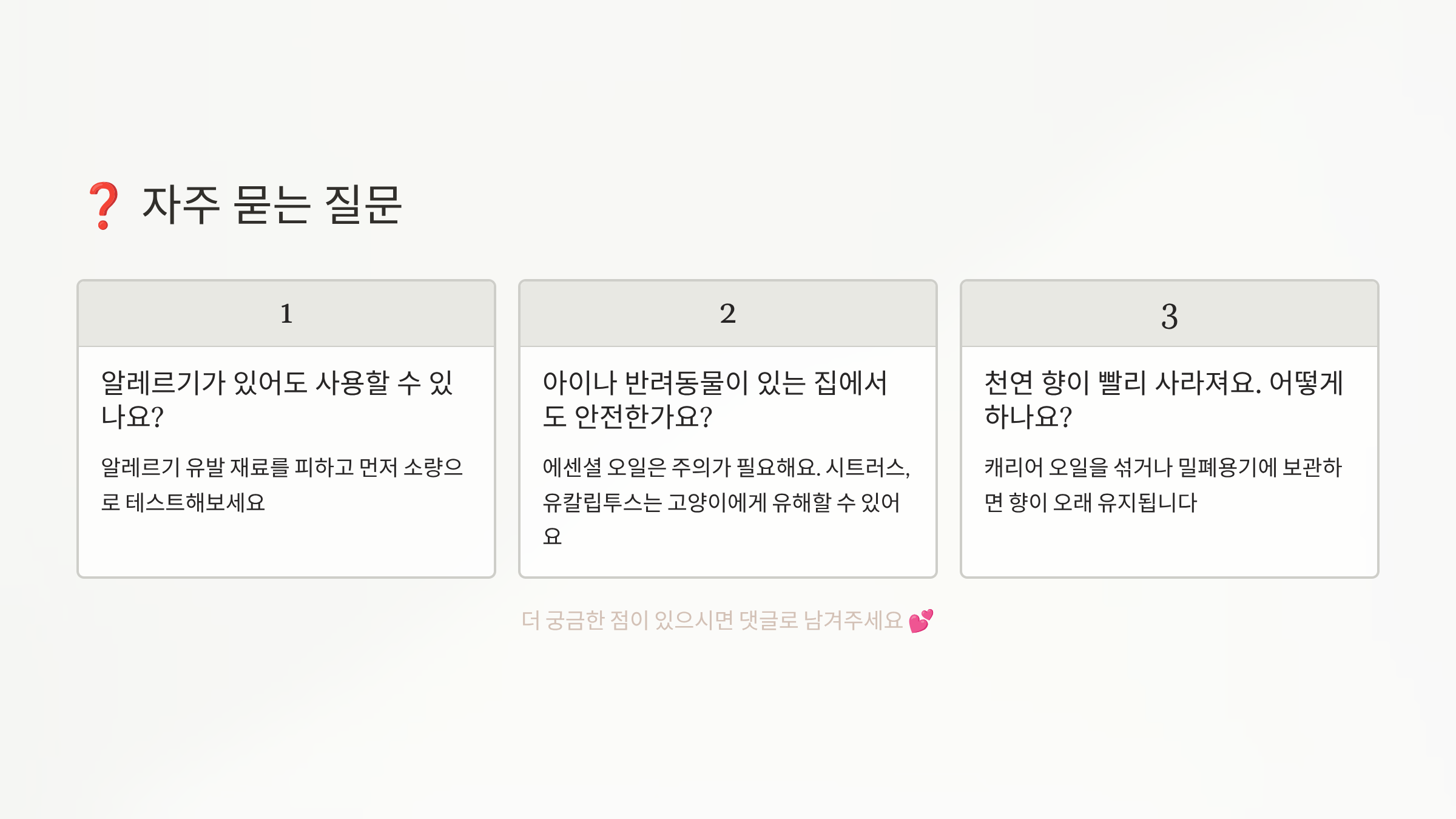 ⚠️ 면책 조항: 이 글은 일반적인 정보 제공을 목적으로 작성되었으며, 개인의 건강 상태나 알레르기 반응은 다를 수 있습니다. 에센셜 오일이나 향료 사용 시 알레르기 테스트를 먼저 진행하고, 임산부, 영유아, 반려동물이 있는 가정에서는 특별히 주의하세요. 호흡기 질환이 있거나 향에 민감한 경우 전문가와 상담 후 사용하시기 바랍니다.