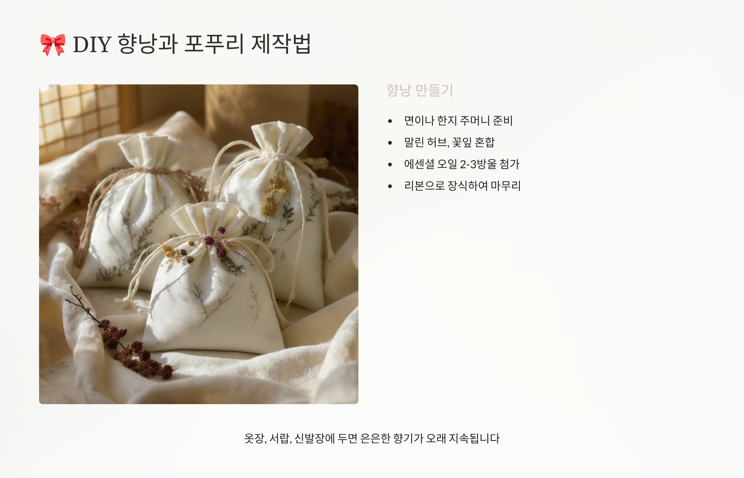 A8. 생각보다 저렴해요! 기본 재료(말린 꽃, 천, 리본)로 향낭 5개를 만드는데 1-2만 원이면 충분해요. 에센셜 오일은 초기 투자가 필요하지만(병당 1-3만 원) 오래 사용할 수 있어요. 정원이나 베란다에서 직접 허브를 키우면 거의 무료예요. 시판 방향제가 개당 5천 원-1만 원인 것을 고려하면, DIY가 훨씬 경제적이고 만드는 재미까지 있답니다. 친구들과 재료를 공동구매하면 더 저렴해요! 💰