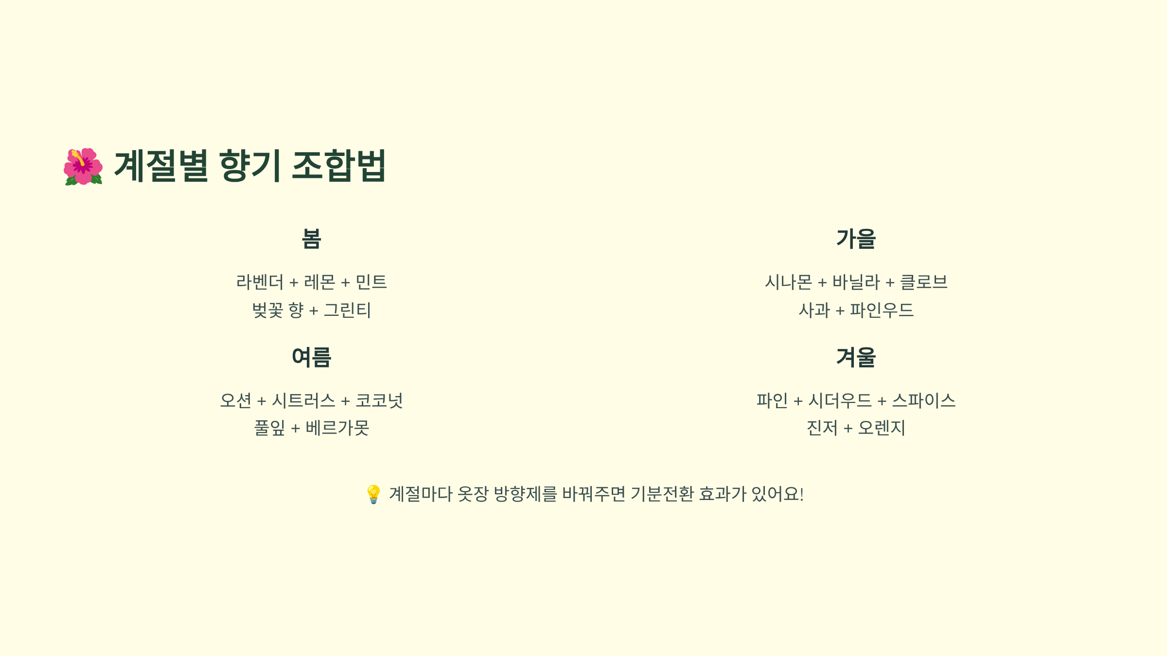 계절에 맞는 향기를 선택하면 옷장 관리가 더욱 효과적이에요. 봄에는 꽃향기가 주는 설렘을, 여름에는 시원한 허브향으로 청량감을, 가을에는 따뜻한 우디향으로 포근함을, 겨울에는 스파이시한 향으로 온기를 더할 수 있답니다. 각 계절의 특성을 살린 향기 조합법을 자세히 알아볼게요! 🌸