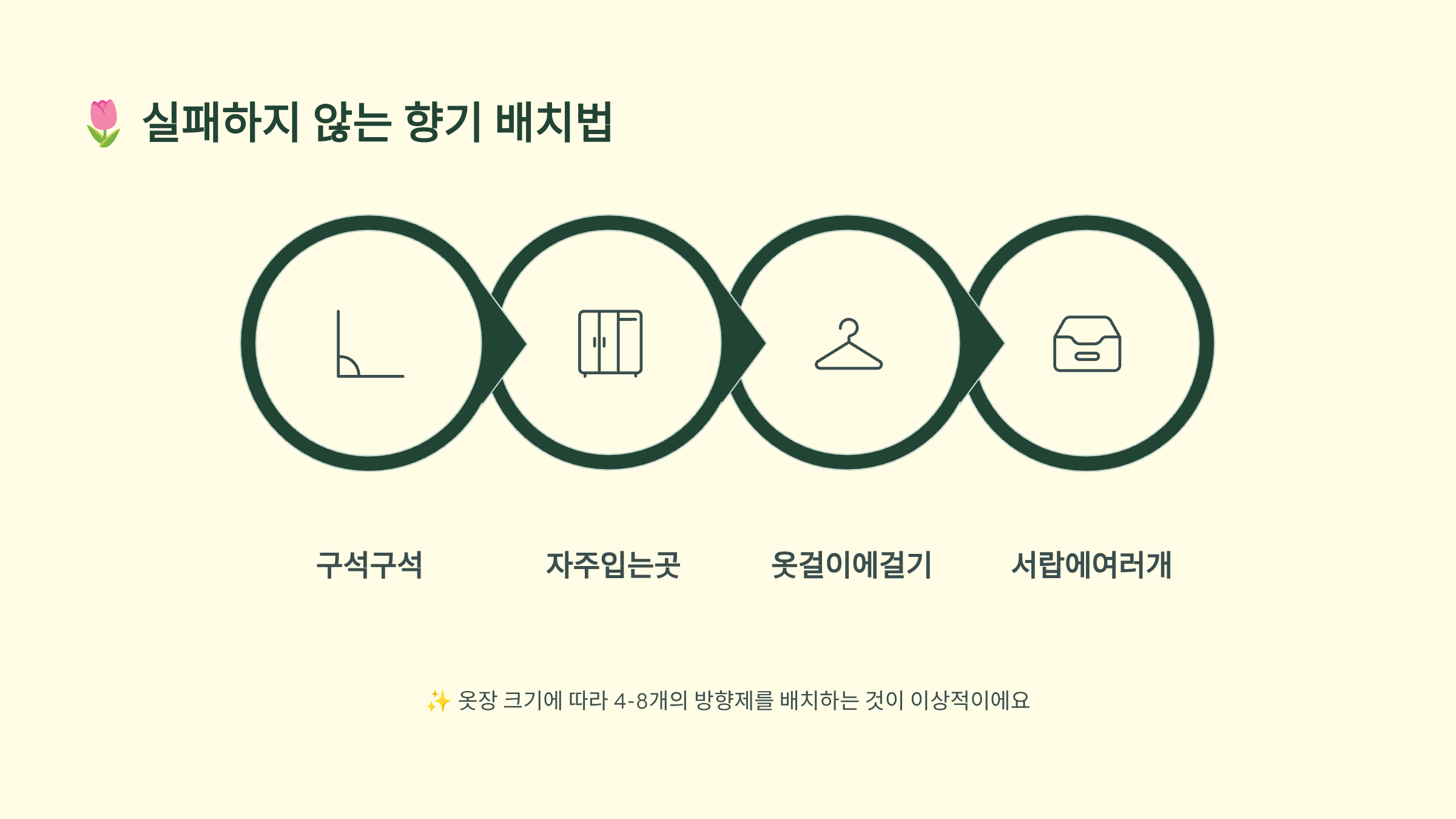 향낭을 어디에 어떻게 배치하느냐에 따라 효과가 천차만별이에요. 옷장의 구조와 크기, 옷의 종류에 따른 최적의 배치법을 알려드릴게요. 일본의 정리 전문가 곤마리와 스웨덴의 라곰 철학을 접목한 실용적인 방법들이랍니다! 🌷