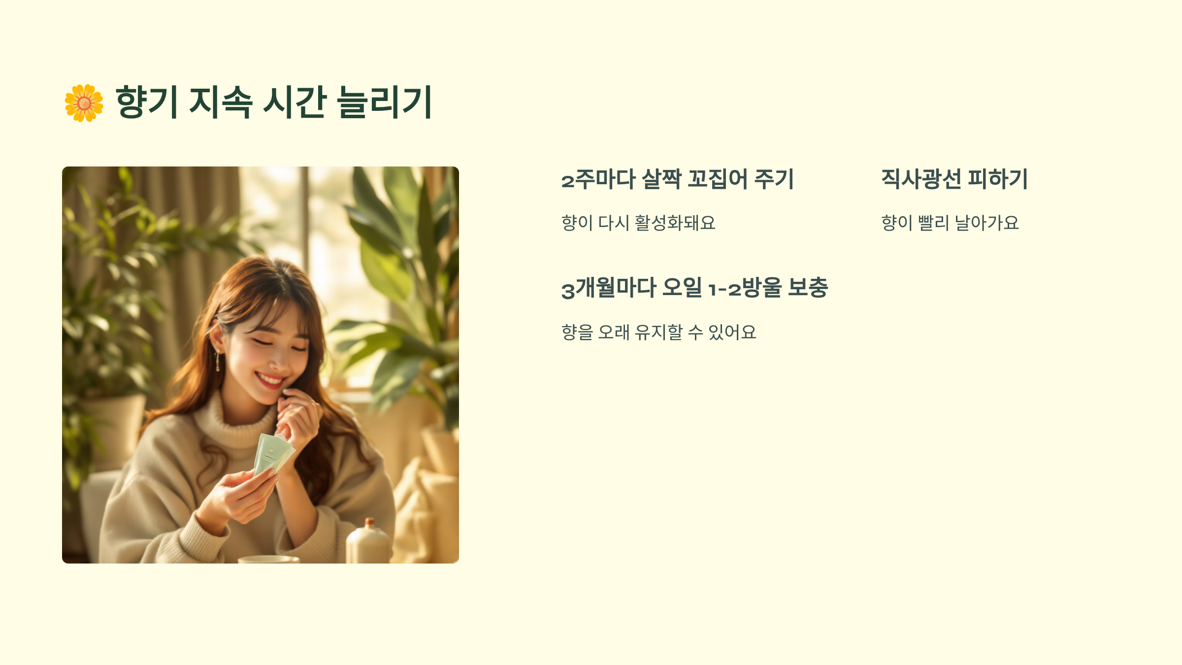 마지막으로 '향기 부스터'를 활용해 보세요. 바닐라 익스트랙트, 통카빈, 벤조인 같은 천연 향 증폭제를 소량 첨가하면 다른 향들을 더욱 풍부하게 만들어줘요. 중동 지역의 전통 향 제조법에서 영감을 받은 기술이랍니다. 이렇게 관리하면 정말 오래오래 좋은 향을 즐길 수 있어요! 🌼