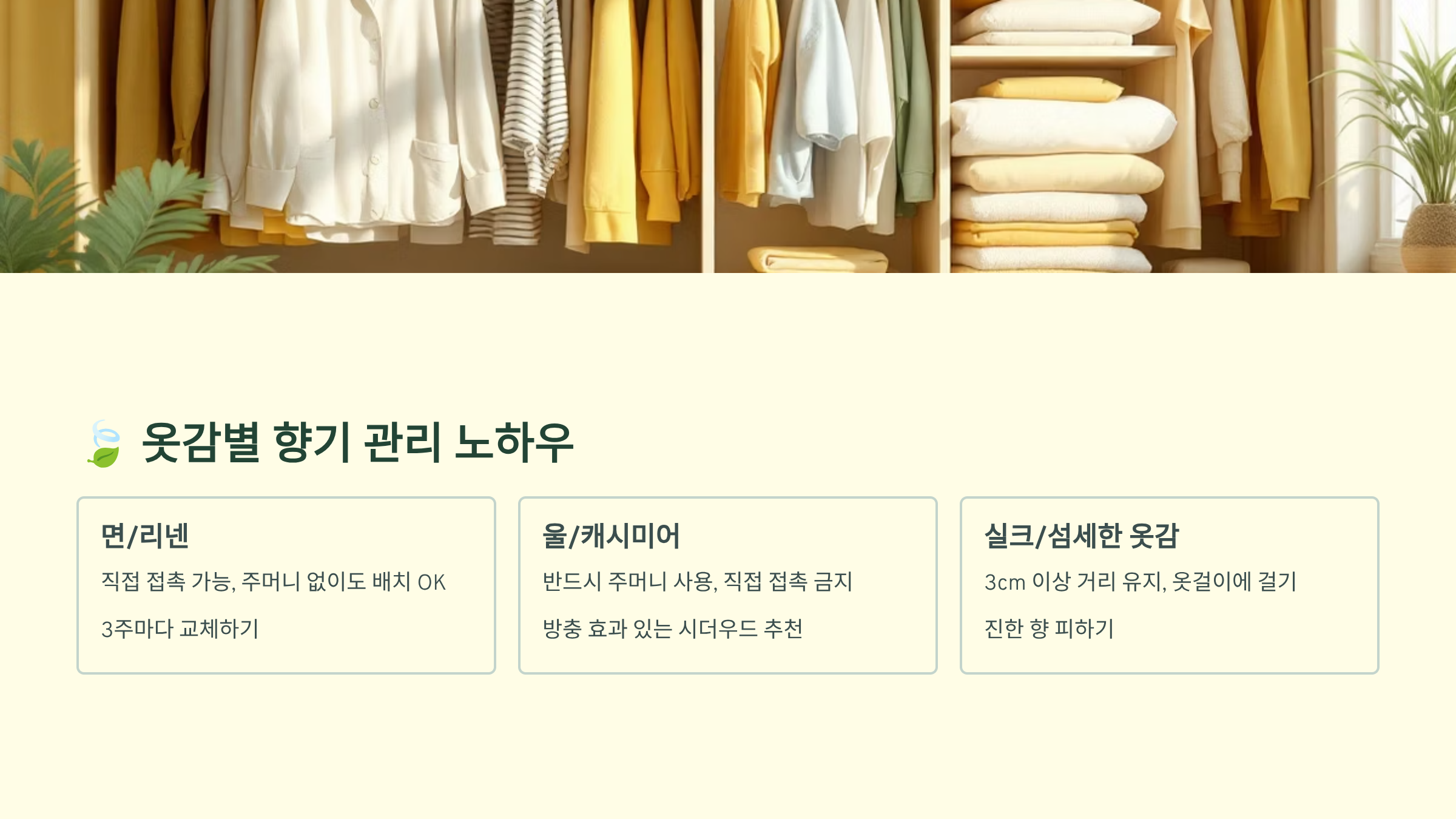 | 울/캐시미어 | 시더우드, 라벤더 | 방충 효과 중요 |