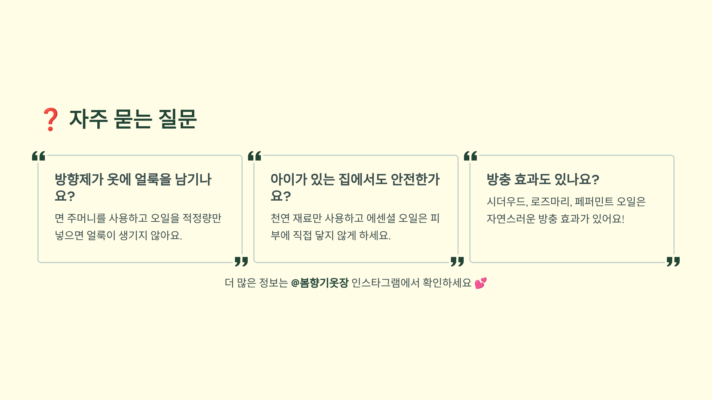 A1. 일반적으로 2-3개월마다 교체하는 게 좋아요. 하지만 사용하는 재료와 보관 환경에 따라 달라질 수 있어요. 향이 약해졌다고 느껴지면 에센셜 오일을 몇 방울 추가하거나 재료를 새로 교체해 주세요. 계절이 바뀔 때마다 교체하면 계절감 있는 향기 관리도 가능하답니다.