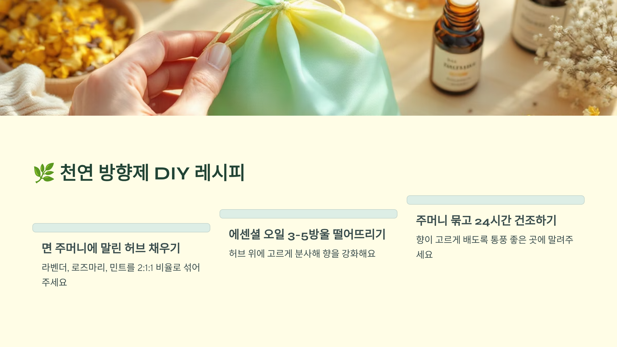 천연 방향제를 직접 만들면 화학 성분 걱정 없이 안전하게 사용할 수 있어요. 제가 5년 동안 실험하면서 찾아낸 최고의 레시피들을 공개할게요! 🌸 첫 번째로 소개할 레시피는 '봄날의 정원' 향낭이에요. 라벤더 2큰술, 장미 꽃잎 1큰술, 레몬그라스 1작은술을 섞어주세요.