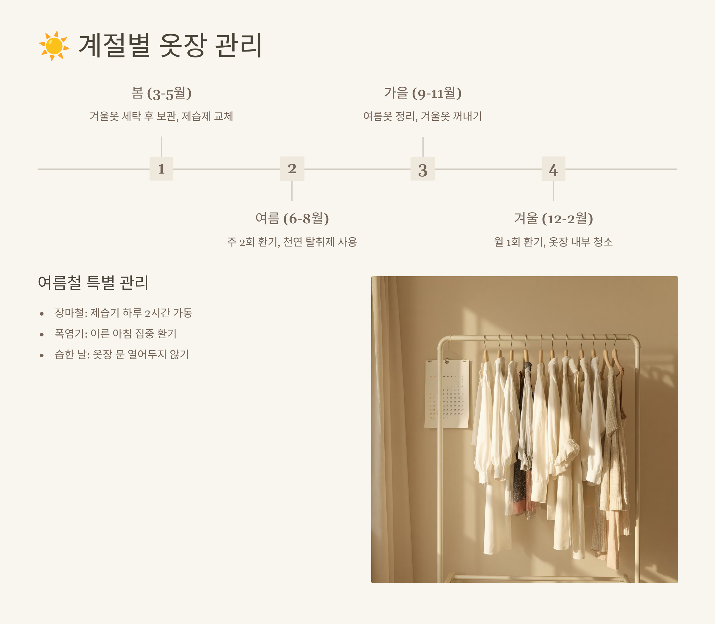 계절마다 옷장 관리 방법을 달리해야 옷을 오래 보관할 수 있어요. 특히 한국처럼 사계절이 뚜렷한 나라에서는 계절별 특성에 맞는 관리법을 알아두는 것이 중요하답니다.