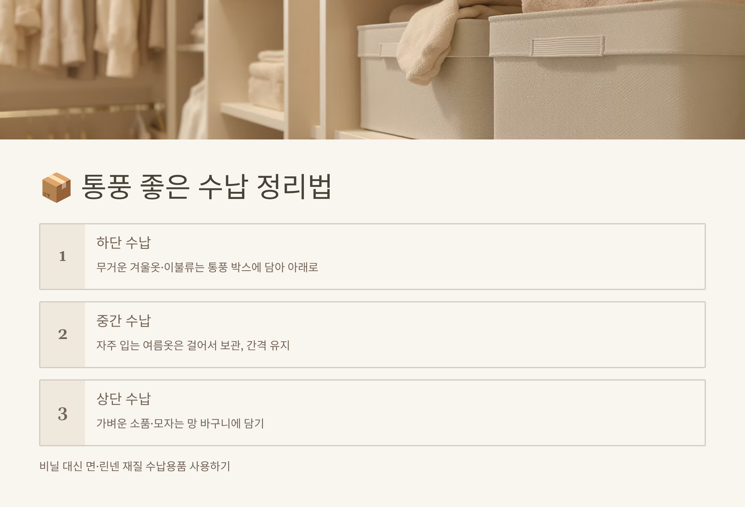 수납 박스는 통풍이 잘 되는 소재를 선택하세요. 라탄이나 대나무로 만든 바구니는 자연스럽게 공기가 통하면서도 습도 조절 기능이 있어요. 플라스틱 수납함을 사용한다면 뚜껑이 없는 오픈형이나 구멍이 뚫린 제품을 선택하는 것이 좋답니다.