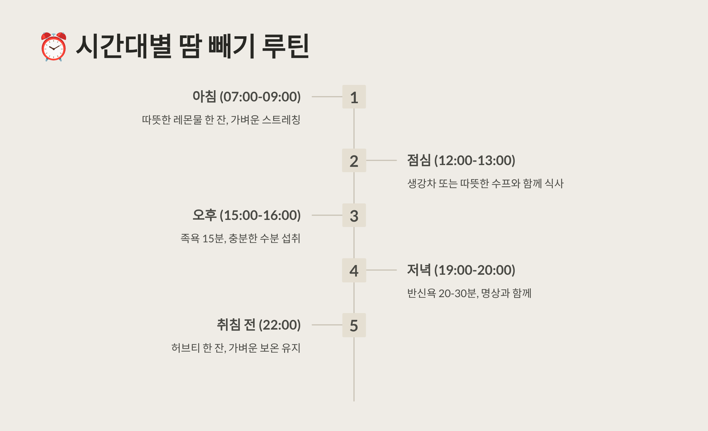 | 07:00 | 온수 샤워 & 스트레칭 | 20분 | 중 |