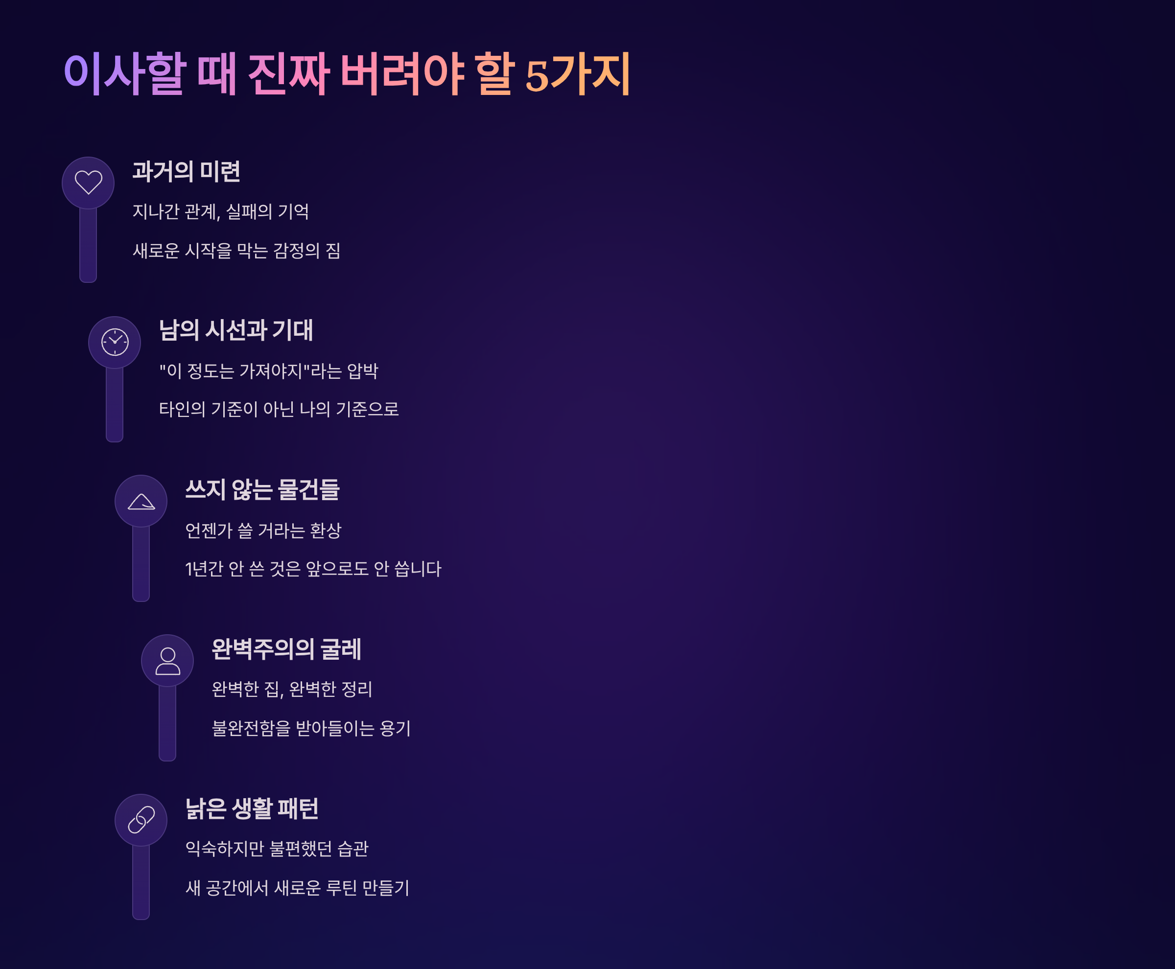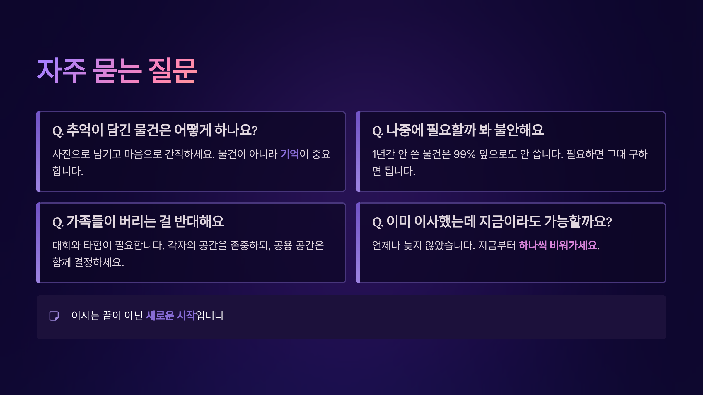 A1. 끝나지 않은 감정, 나쁜 습관, 독이 되는 관계, 부정적 자기 인식, 과거에 대한 집착 등 눈에 보이지 않는 심리적 짐을 함께 정리해야 새 공간에서 진정한 새 출발을 할 수 있어요.