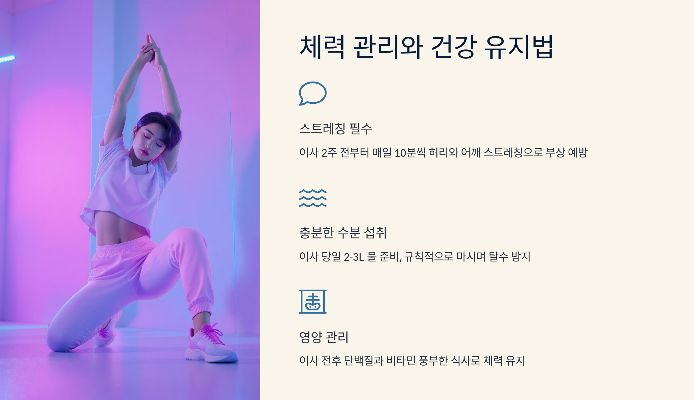 이사 준비 기간 동안 체력 관리는 정말 중요해요. 많은 분들이 이사 준비에만 집중하다가 정작 이사 당일에는 체력이 바닥나서 고생하는 경우가 많거든요. 이사 2주 전부터는 규칙적인 운동과 충분한 수면으로 컨디션을 최상으로 유지하는 것이 필요해요. 특히 평소 운동을 하지 않던 분들은 가벼운 스트레칭부터 시작해 보세요.