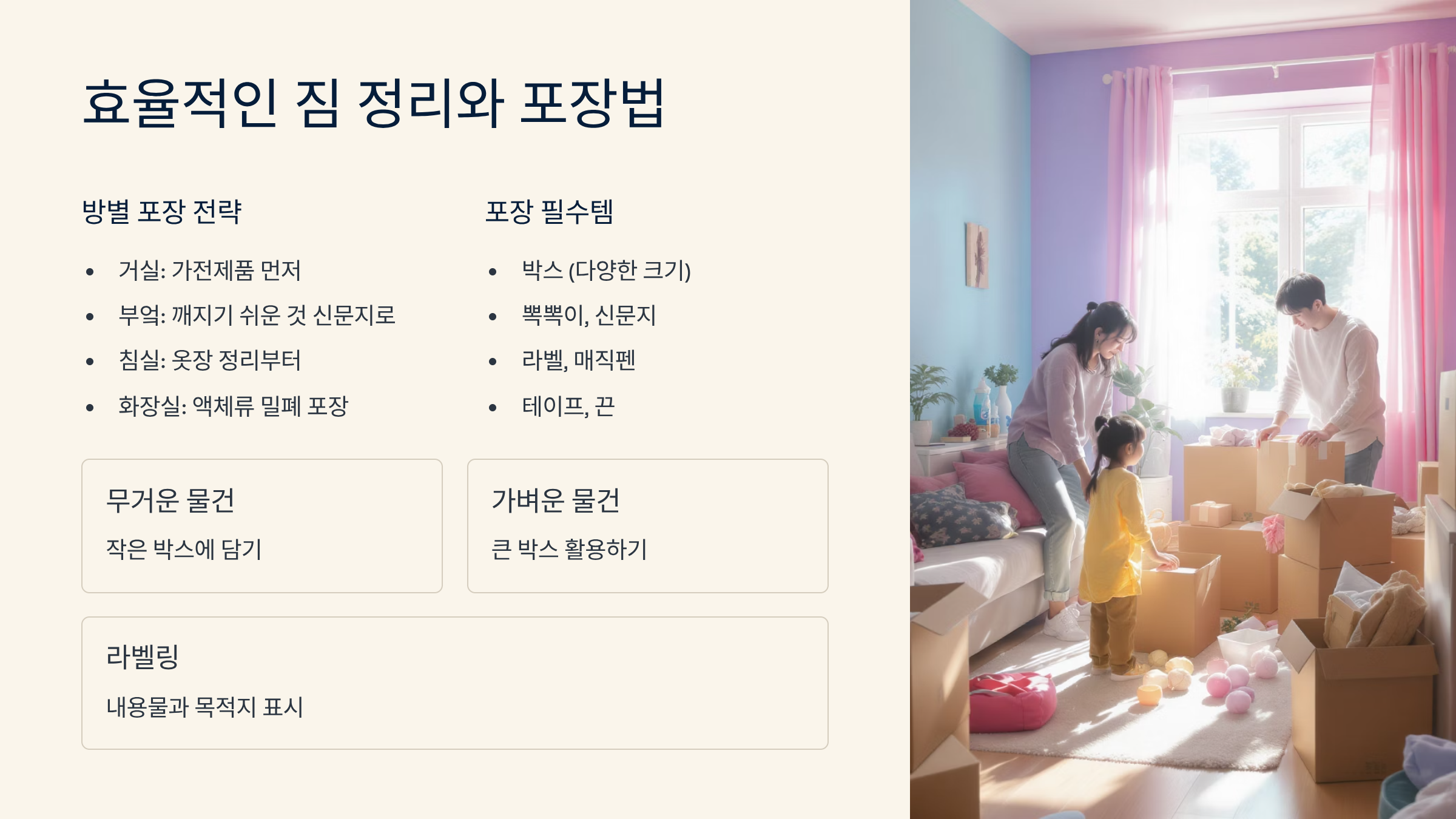 짐 포장은 이사 준비 중 가장 시간과 에너지가 많이 드는 작업이에요. 하지만 효율적인 방법을 알면 피로를 크게 줄일 수 있답니다. 먼저 방별로 짐을 분류하고, 박스마다 내용물과 목적지를 명확히 표시하는 것부터 시작하세요. 컬러 스티커나 테이프를 활용하면 한눈에 구분이 가능해요.