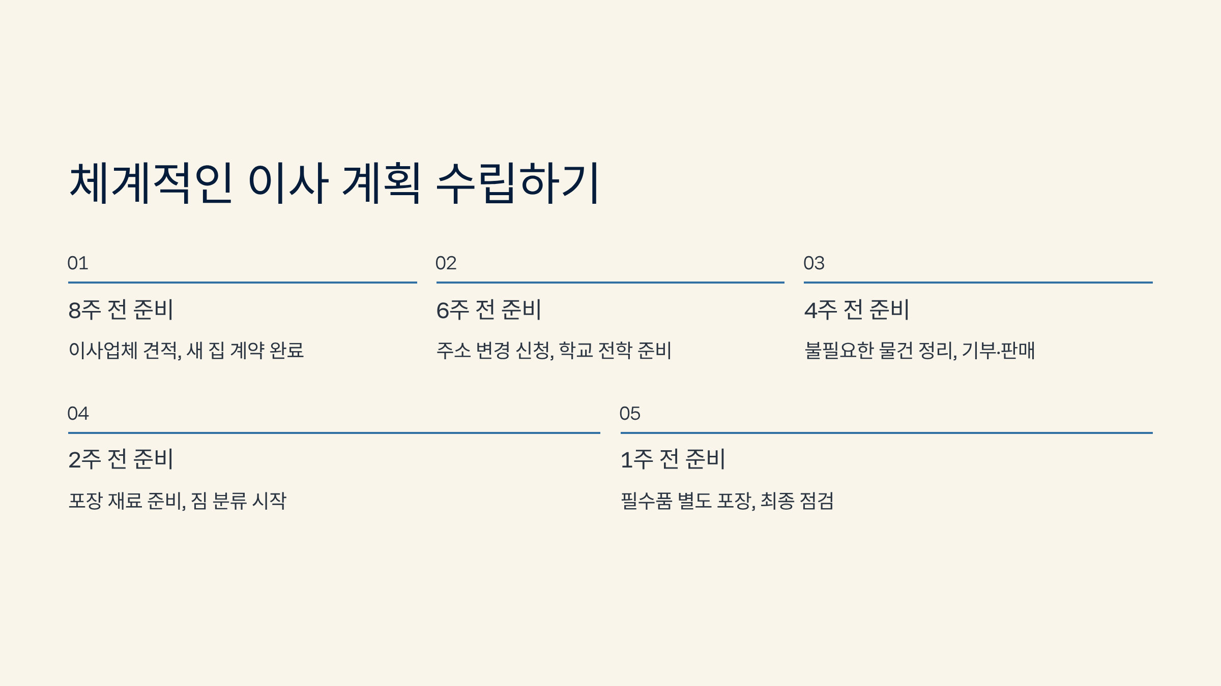 이사 준비는 최소 2개월 전부터 시작하는 게 이상적이에요. 많은 분들이 급하게 준비하다가 정신없이 이사하게 되는데, 이게 바로 피로의 주범이랍니다. 체계적인 계획 수립은 이사 스트레스를 절반 이상 줄여줄 수 있어요. 먼저 이사 날짜를 정하고 역산해서 주별 계획을 세우는 것부터 시작해 보세요.