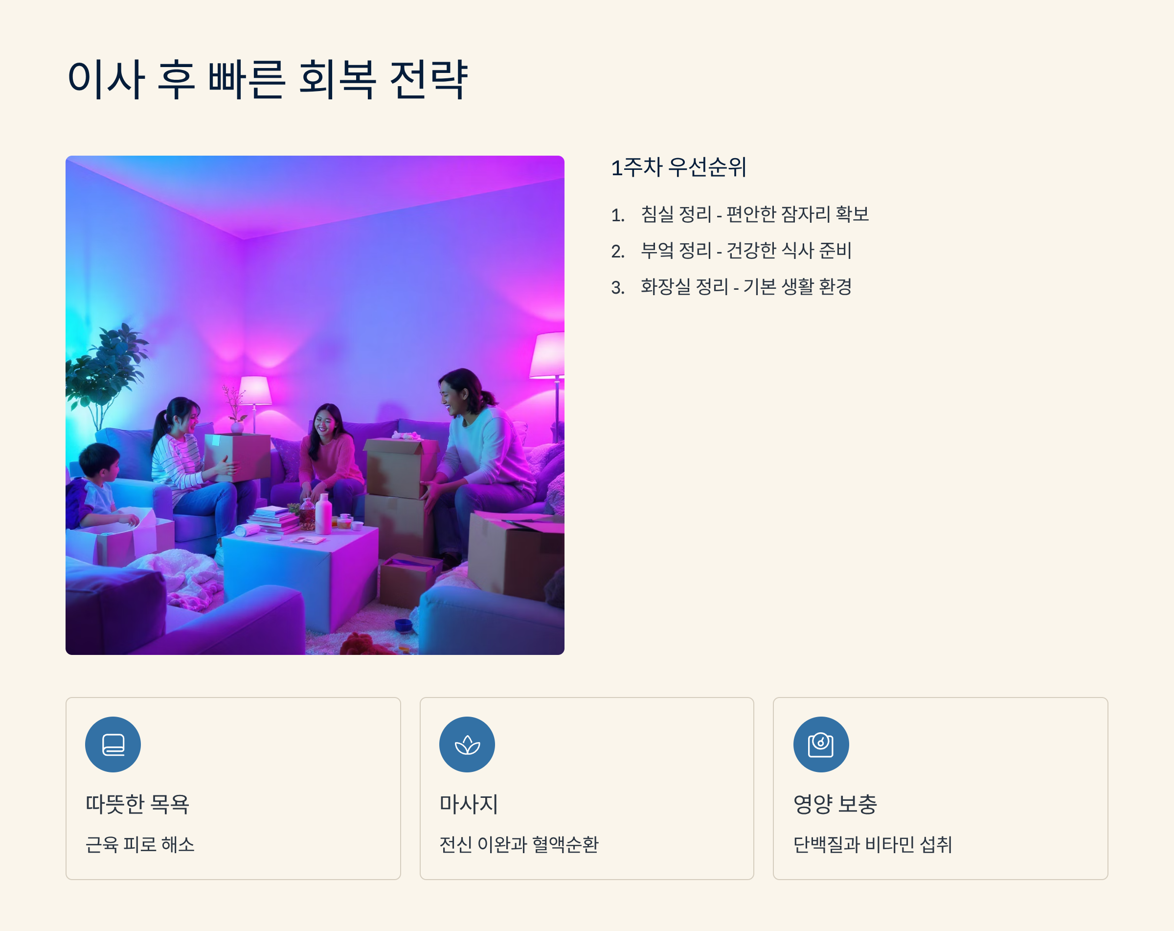 이사가 끝났다고 바로 일상으로 돌아가려 하면 안 돼요. 최소 2-3일은 회복 기간으로 잡고 천천히 적응해 가는 것이 좋아요. 첫날은 최대한 휴식을 취하면서 몸의 피로를 풀어주세요. 따뜻한 물로 목욕을 하거나 가벼운 스트레칭으로 근육을 이완시키는 것이 도움이 돼요. 충분한 수면은 필수랍니다.