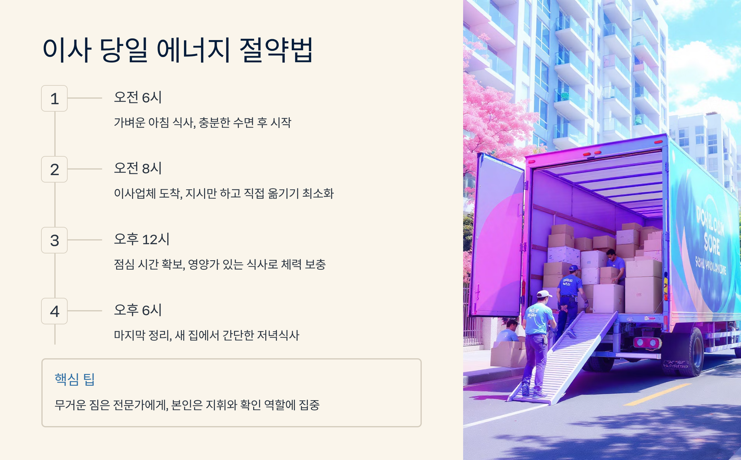 본인이 직접 모든 것을 감독하려 하지 마세요. 전문가들에게 맡길 건 맡기고, 꼭 필요한 부분만 체크하면 돼요. 계속 서서 지켜보면 체력만 소모되고 오히려 작업에 방해가 될 수 있어요. 중간중간 앉아서 쉬면서 체력을 보존하세요. 이사 당일은 마라톤이 아니라 릴레이 경주라고 생각하면 좋아요. 🏃♂️