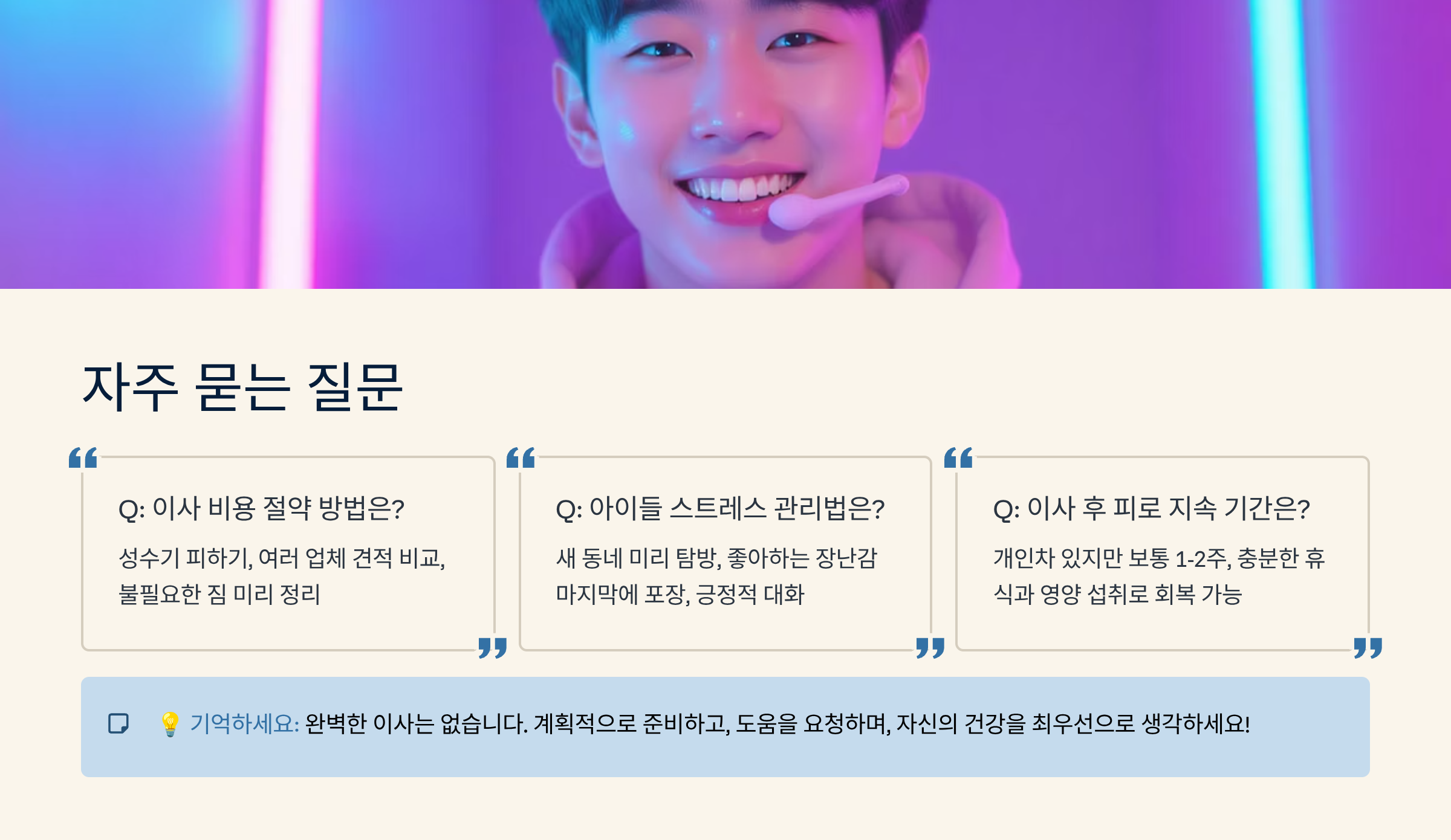 본 글에서 제공하는 정보는 일반적인 참고용으로 작성되었으며, 개인의 상황에 따라 적용이 다를 수 있습니다. 건강 관련 내용은 의학적 조언을 대체할 수 없으며, 심각한 증상이 있을 경우 반드시 전문가와 상담하시기 바랍니다. 이사 업체 선정 및 계약 시에는 반드시 여러 업체를 비교하고 계약 조건을 꼼꼼히 확인하시길 권합니다.