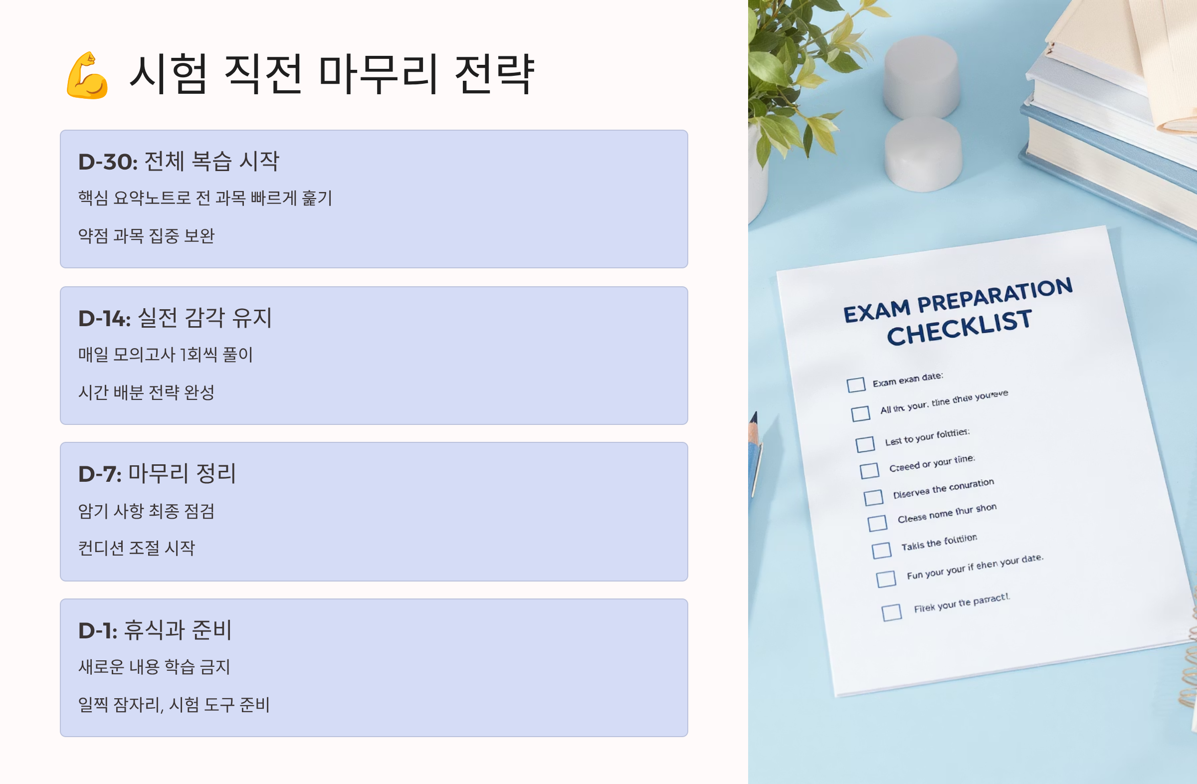 시험 D-7일부터는 새로운 내용을 공부하기보다 지금까지 학습한 내용을 정리하는 데 집중해야 해요. 이 시기에 욕심내서 새로운 걸 시작하면 오히려 혼란만 가중돼요. 대신 핵심 요약본, 오답노트, 마인드맵을 반복해서 보면서 전체 내용을 머릿속에 정리하세요. 완벽하지 않아도 괜찮아요, 아는 것을 확실하게 만드는 게 더 중요해요! 💯