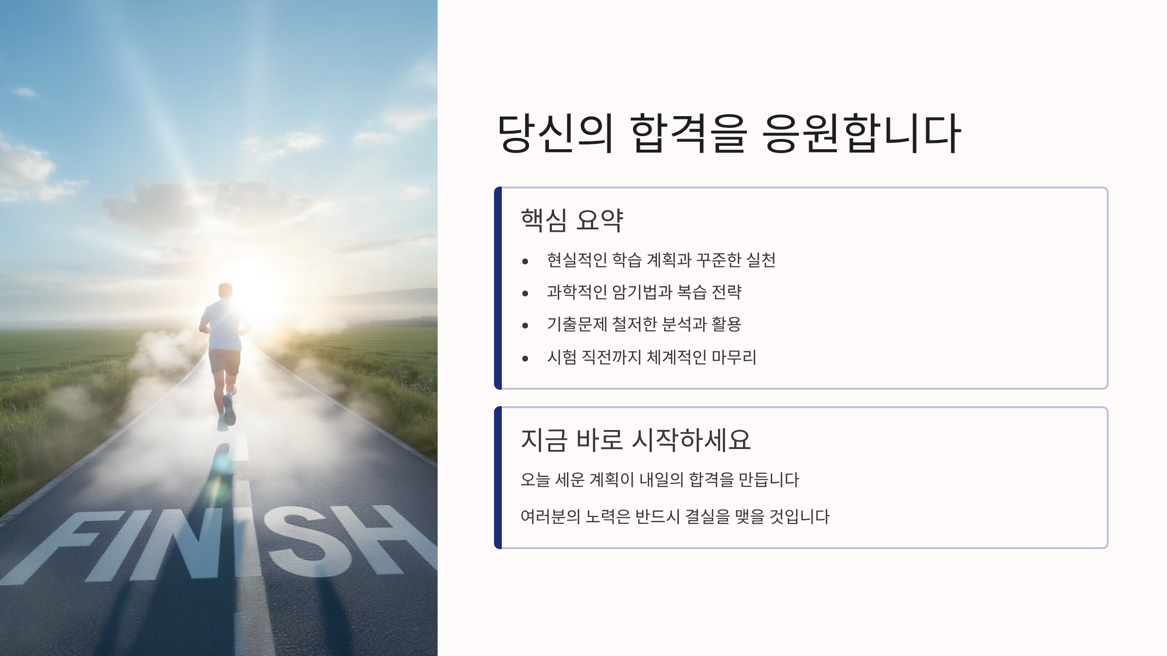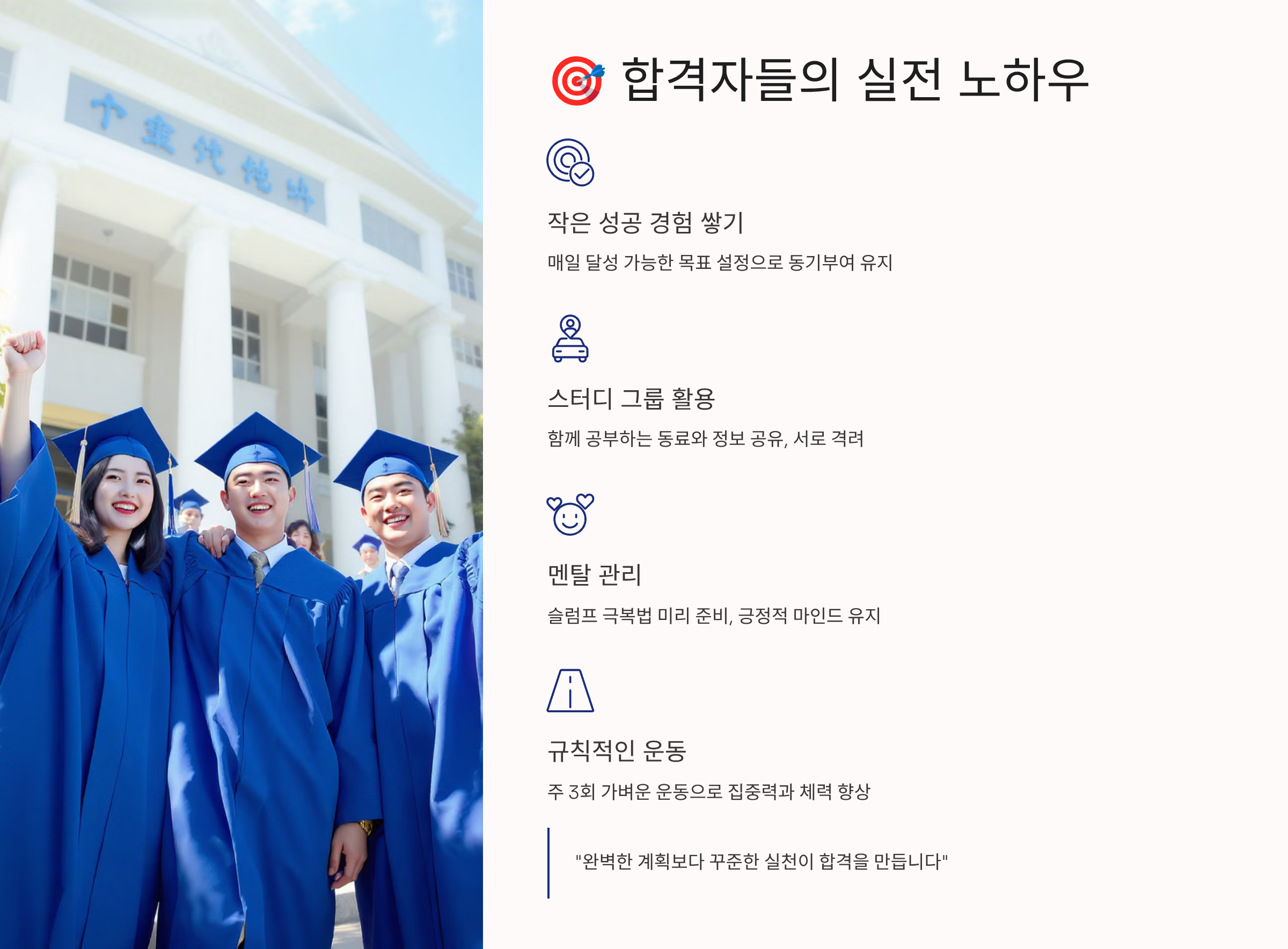 마지막으로 자신만의 루틴을 만드세요. 합격자들은 각자 자신만의 공부 루틴이 있었어요. 어떤 사람은 새벽 공부가 잘 맞고, 어떤 사람은 밤늦게 공부하는 것을 선호해요. 커피 한 잔과 함께 시작하는 사람도 있고, 클래식 음악을 들으며 공부하는 사람도 있죠. 정답은 없어요. 여러 가지 시도해 보고 자신에게 가장 잘 맞는 방법을 찾는 것이 중요해요.