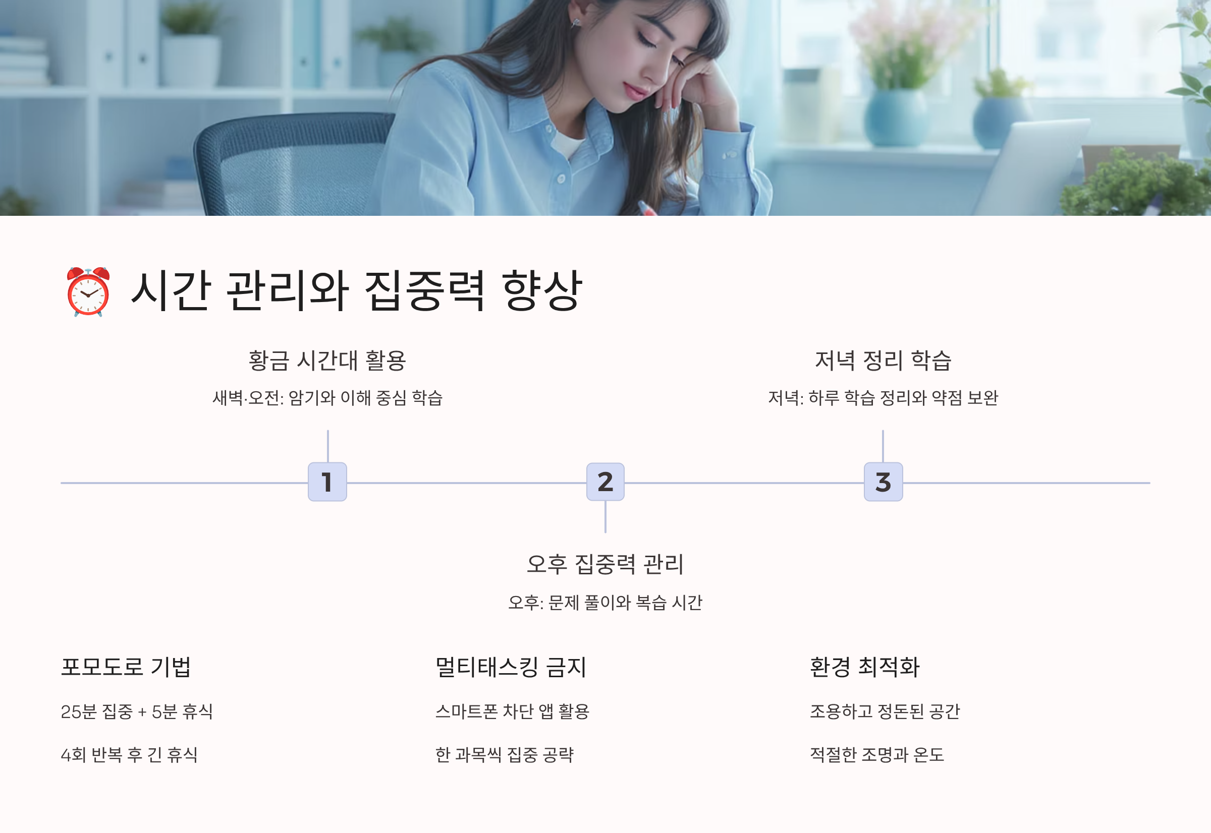 바이오리듬을 파악하고 활용하세요. 사람마다 집중력이 높은 시간대가 달라요. 어떤 사람은 아침에, 어떤 사람은 밤에 더 잘 집중하죠. 일주일 정도 관찰해 보고 자신의 황금 시간대를 찾으세요. 그 시간에는 가장 어렵고 중요한 공부를 하고, 집중력이 떨어지는 시간에는 단순 암기나 복습을 하는 거예요. 🌅