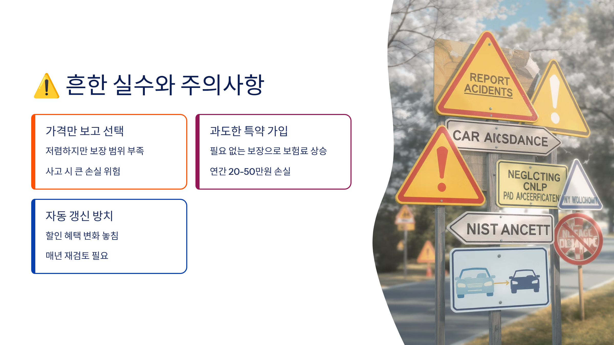 자동차 보험 가입 시 가장 흔한 실수는 가격만 보고 선택하는 거예요. 보험료가 싸다고 무조건 좋은 것은 아니에요. 보장 범위가 제한적이거나, 자기 부담금이 높거나, 사고 처리가 까다로운 경우가 많거든요. 특히 온라인 디렉트 보험의 경우, 표면적인 보험료는 저렴하지만 실제 사고 시 본인이 처리해야 할 일이 많아서 스트레스를 받을 수 있어요. 보험료와 서비스 품질의 균형을 잘 맞추는 것이 중요해요.