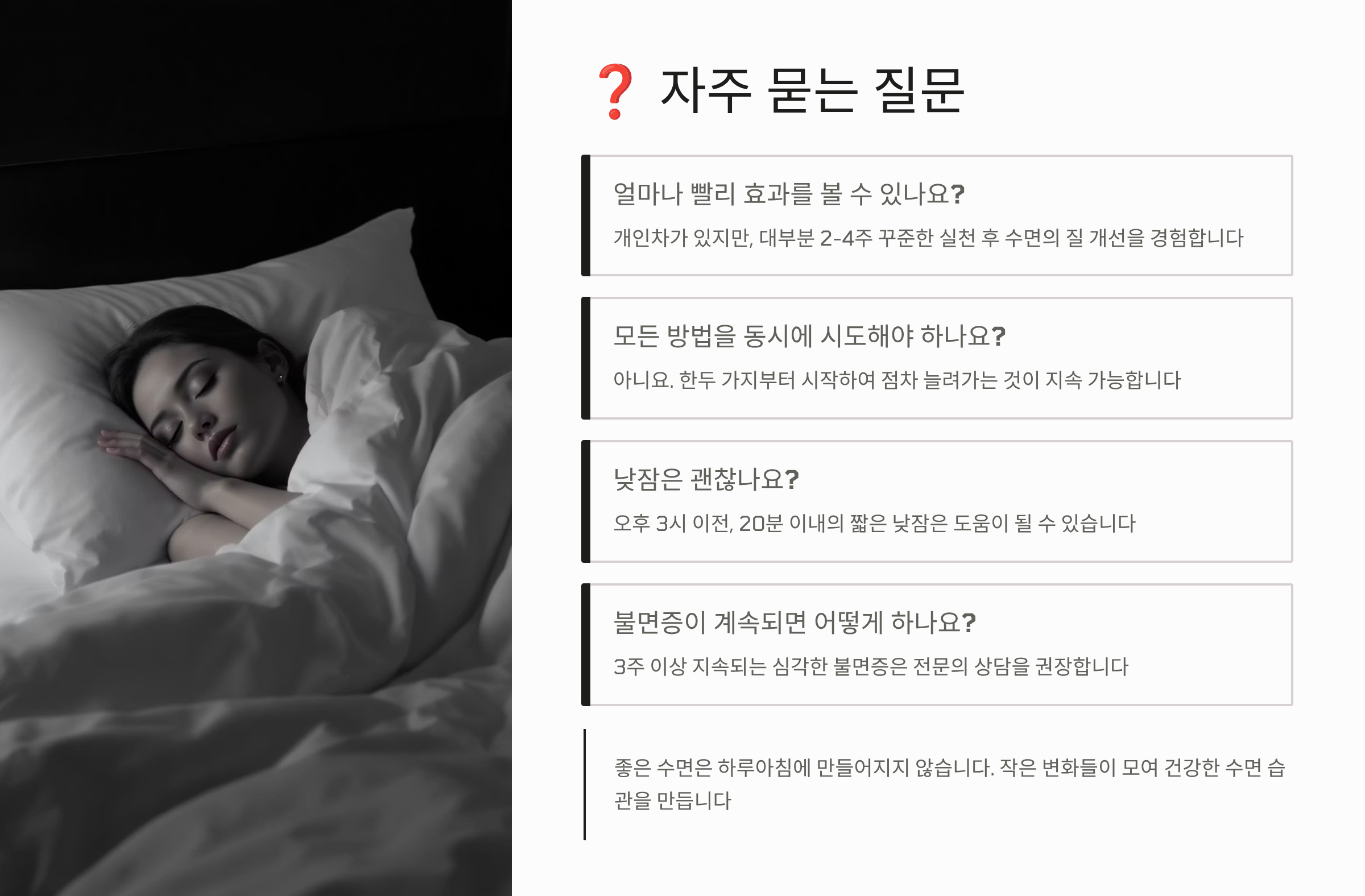 수면 의식의 가장 큰 장점은 약물 없이 자연스럽게 수면을 개선할 수 있다는 것입니다. 호흡법, 명상, 아로마세러피 등은 부작용이 거의 없고, 스트레스 관리에도 도움이 됩니다. 매일 밤 편안하게 잠들고 상쾌하게 일어나는 경험은 하루를 시작하는 에너지가 되고, 일의 생산성을 높여줍니다.