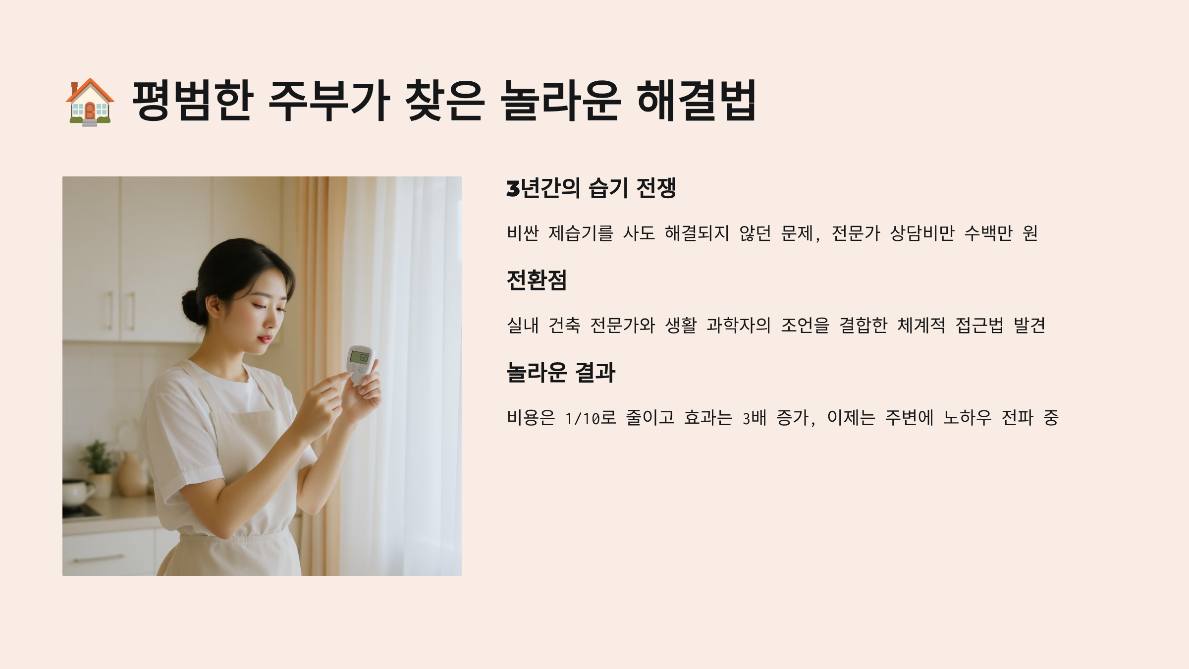 경기도 용인에 사는 정 모 씨(45세)의 이야기를 들려드릴게요. 그녀는 3년 전까지만 해도 장마철이 오면 우울증에 시달렸어요. 남편과 두 아이를 위해 깨끗한 집을 유지하려 했지만, 습기와의 전쟁에서 늘 패배하는 기분이었죠.