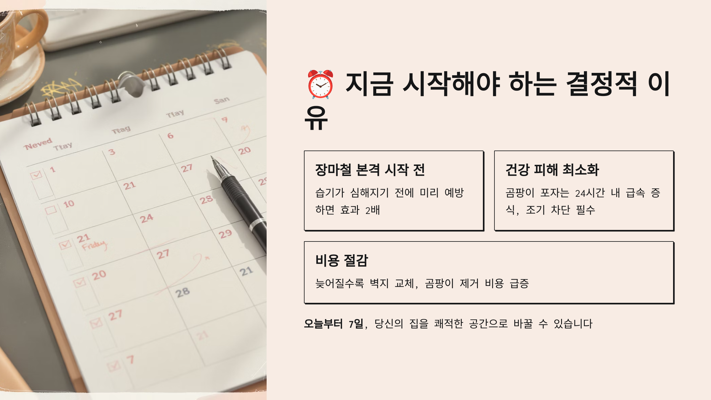 전문가들은 장마 시작 2주 전이 골든타임이라고 해요. 이 시기를 놓치면 습도가 급격히 올라가 관리가 훨씬 어려워지죠. 지금 바로 시작한다면 충분한 여유를 가지고 체계적으로 준비할 수 있어요. 망설이는 시간만큼 피해는 커진다는 것을 명심하세요! 🚀
