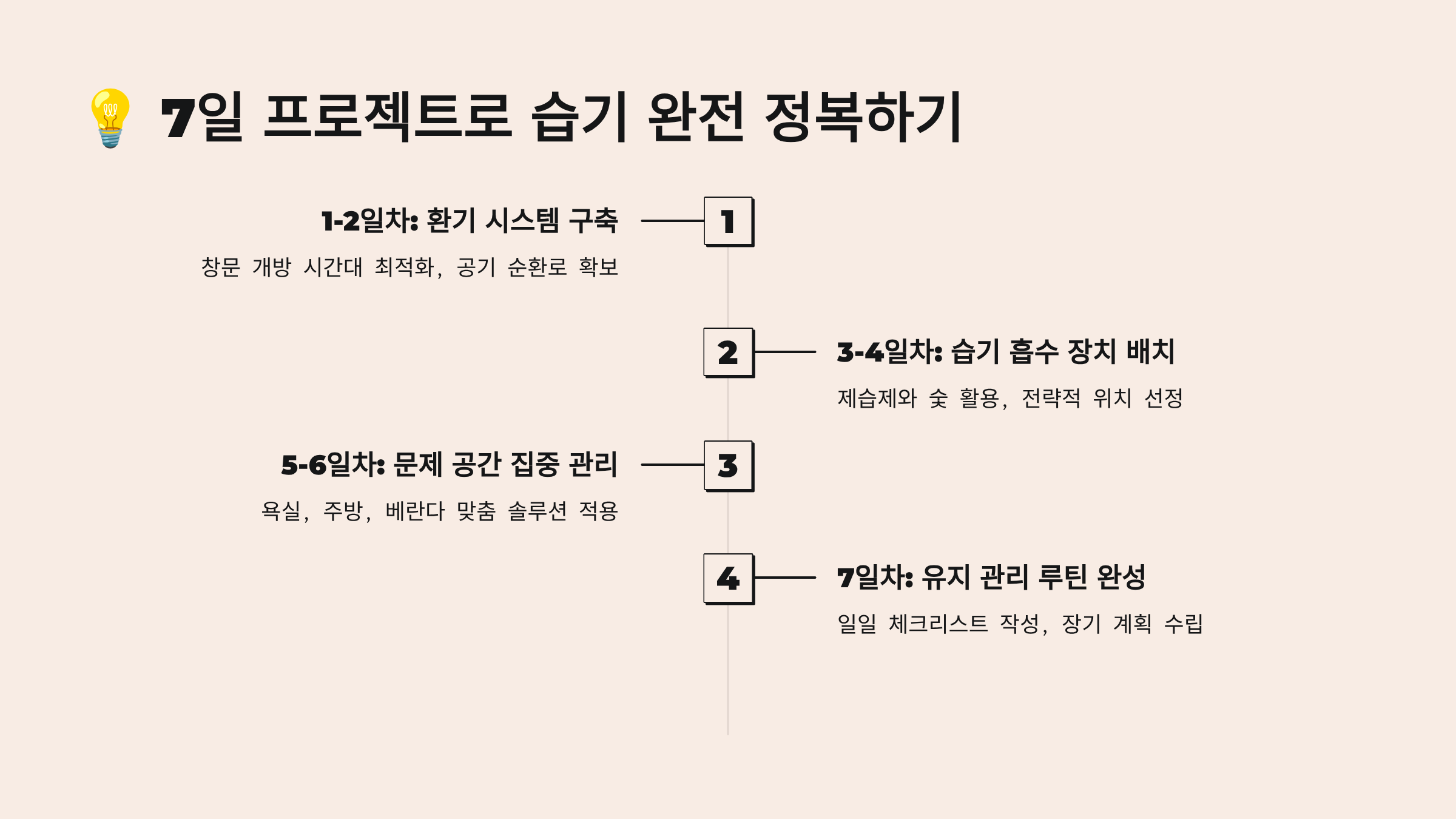 이제부터 소개할 7일 프로젝트는 체계적이고 과학적인 접근법으로 장마철 습기 문제를 완벽하게 해결해요. 매일 다른 공간과 방법에 집중하여 효율적으로 진행하는 것이 핵심이죠. 준비물도 특별한 것 없이 집에 있는 물건들과 마트에서 쉽게 구할 수 있는 것들이에요.