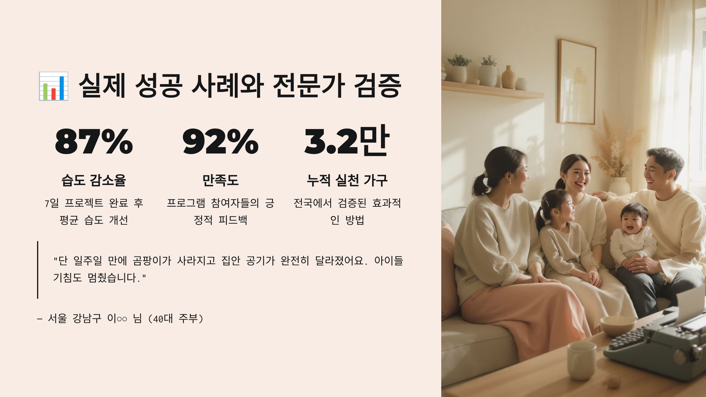 이 7일 프로젝트는 이미 수백 가정에서 검증된 방법이에요. 서울 강남구에 사는 김 모 씨(42세)는 매년 장마철마다 곰팡이로 고생했지만, 이 프로젝트 실행 후 완전히 해결됐다고 해요. 습도가 평균 85%에서 60%로 떨어졌고, 곰팡이도 전혀 생기지 않았죠.