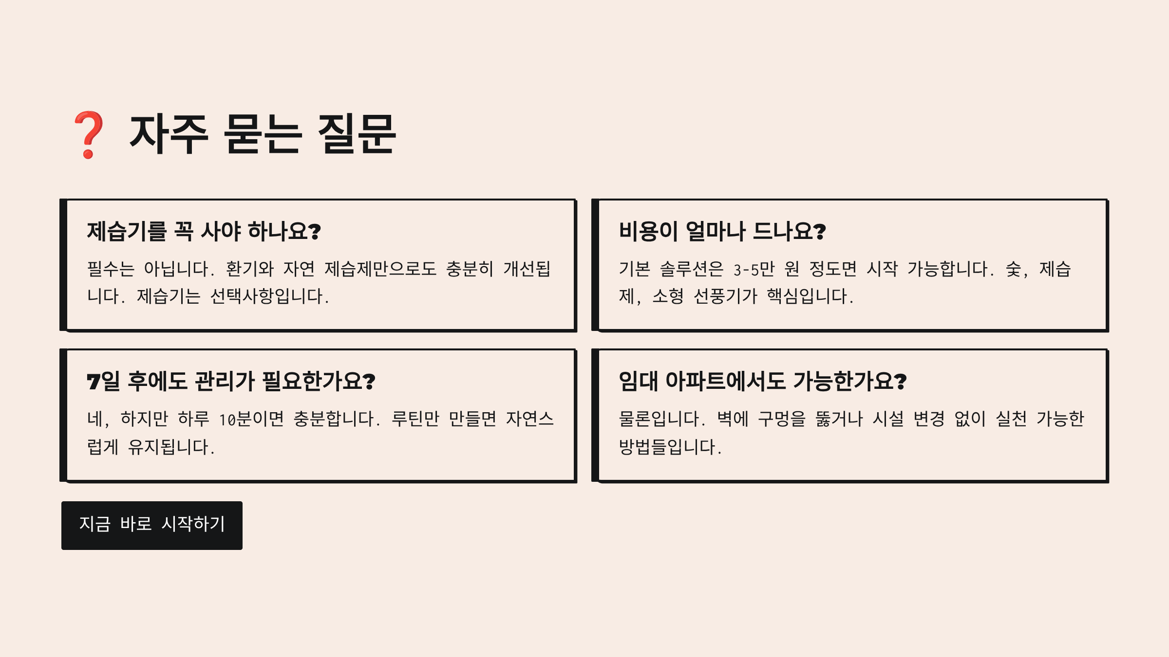 부산의 박 모 씨(38세) 가정은 바닷가 근처라 습도가 특히 높았어요. 아이들이 비염과 아토피로 고생했는데, 7일 프로젝트 후 증상이 현저히 개선됐다고 해요. 병원비만 월 30만 원씩 들었는데, 이제는 거의 병원에 가지 않는다네요.