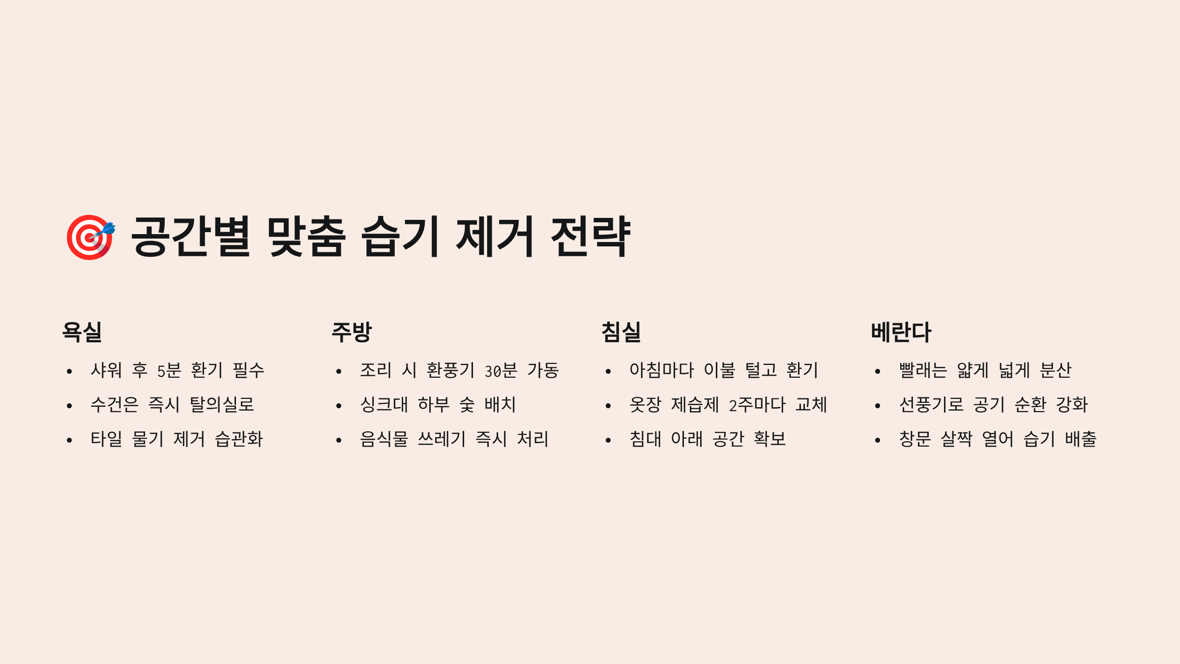 | 침실 | 침구 습기 | 매일 환기, 주 1회 일광소독 |