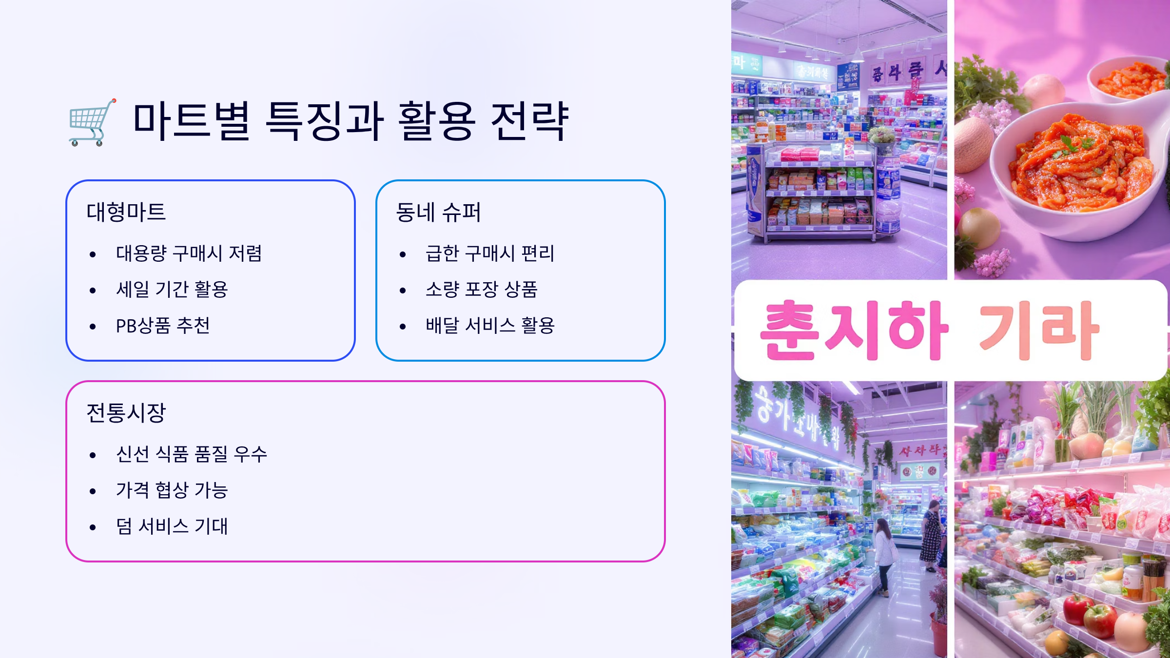 각 마트마다 고유한 특징과 장단점이 있어요. 이마트는 신세계 계열답게 프리미엄 상품 라인업이 강하고, 피코크 같은 PB 상품의 품질이 좋아요. 특히 와인이나 치즈 같은 수입 식품 종류가 다양해서 특별한 날 장보기에 적합하답니다. 신세계포인트를 적립하면 백화점에서도 사용할 수 있어 활용도가 높아요.