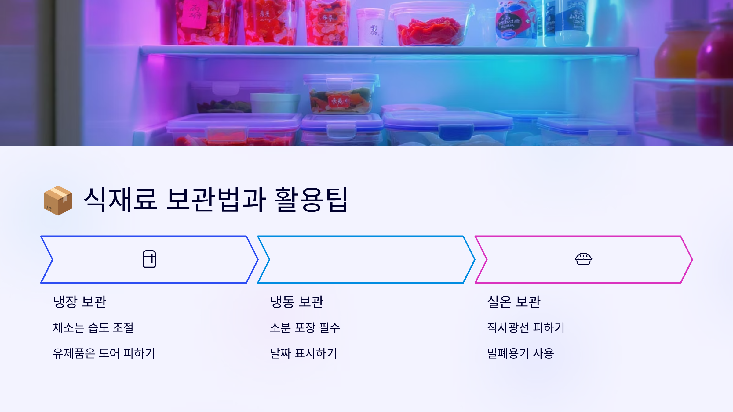 냉장고 정리 정돈도 식재료 관리의 핵심이에요. 냉장고 문에는 자주 사용하는 소스류를, 위쪽 선반에는 남은 음식이나 반찬을, 아래쪽 서랍에는 채소와 과일을 보관하는 것이 좋아요. 투명한 용기를 사용하면 내용물을 쉽게 확인할 수 있어 중복 구매를 방지할 수 있답니다.