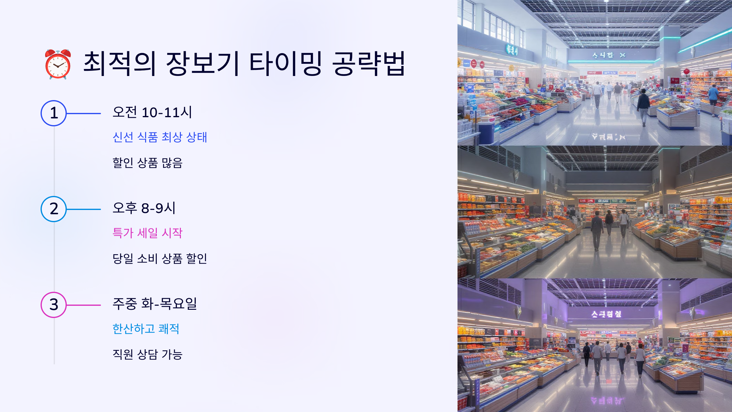 시간대별로도 장보기 전략이 달라져요. 오전 10시경은 가장 신선한 상품을 구매할 수 있는 시간이고, 오후 7시 이후는 당일 판매하지 못한 신선식품들을 할인 판매하는 타임세일 시간이랍니다. 특히 베이커리나 반찬 코너는 마감 1-2시간 전에 30-50% 할인을 하는 경우가 많아요.