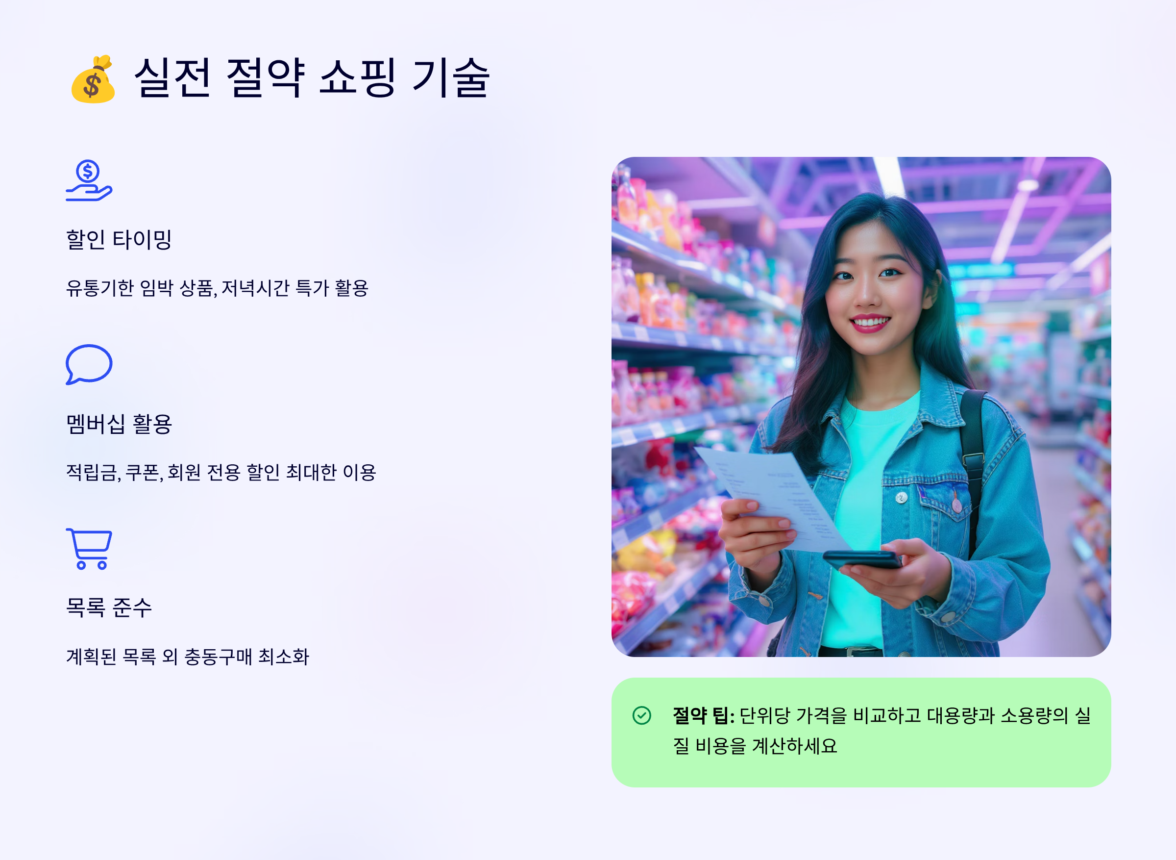 대량 구매와 소량 구매를 적절히 조합하는 것도 현명한 전략이에요. 보관이 오래 가능한 생활용품이나 조미료는 대량으로 구매하고, 신선식품은 필요한 만큼만 자주 구매하는 것이 좋답니다. 특히 코스트코나 이마트 트레이더스 같은 창고형 마트를 활용하면 대량 구매 시 상당한 금액을 절약할 수 있어요.